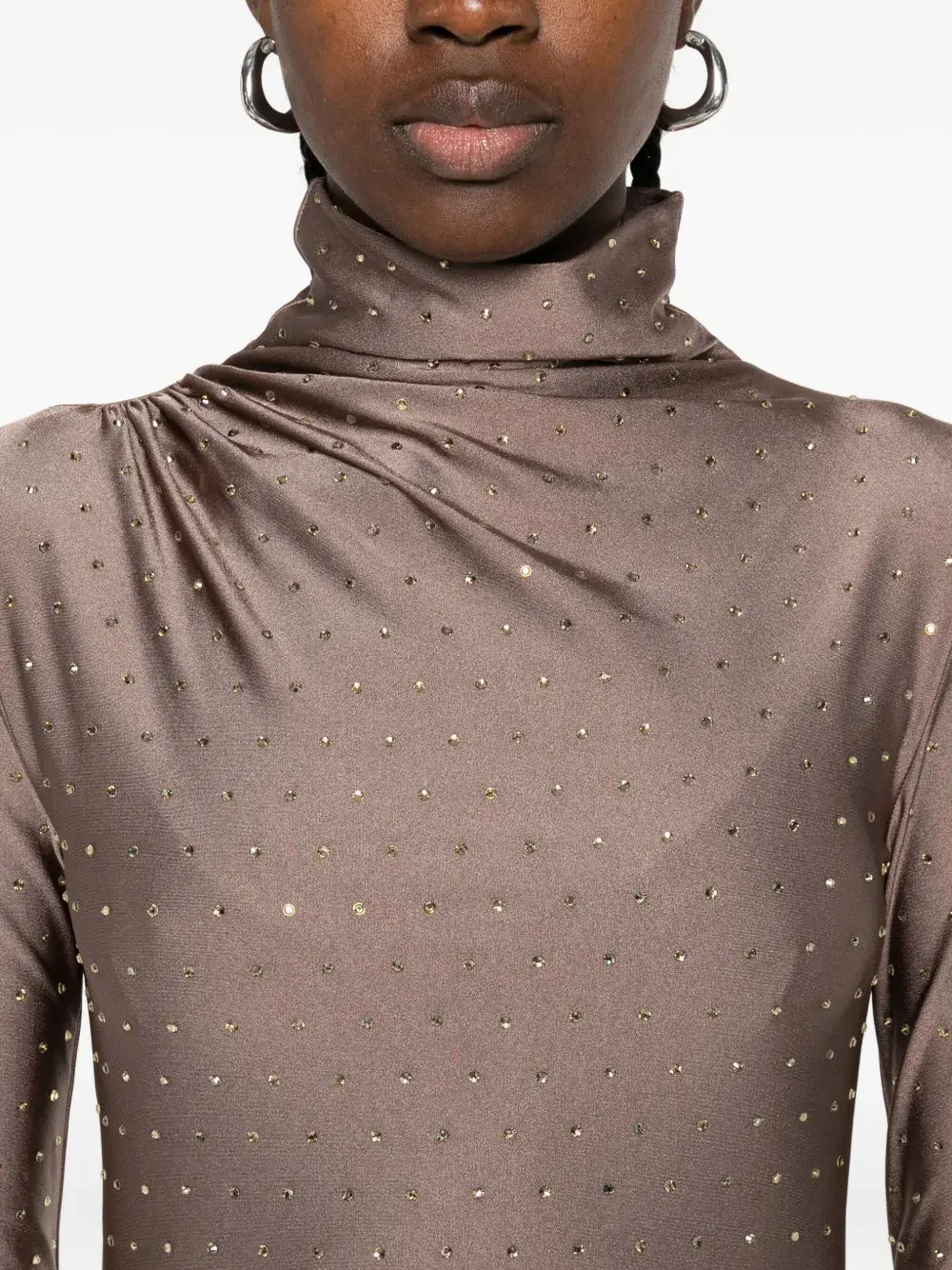 Highlights beige high neck long sleeves rhinestone embellishment ruched bodice Composition Polyamide 80%, Elastane 20%