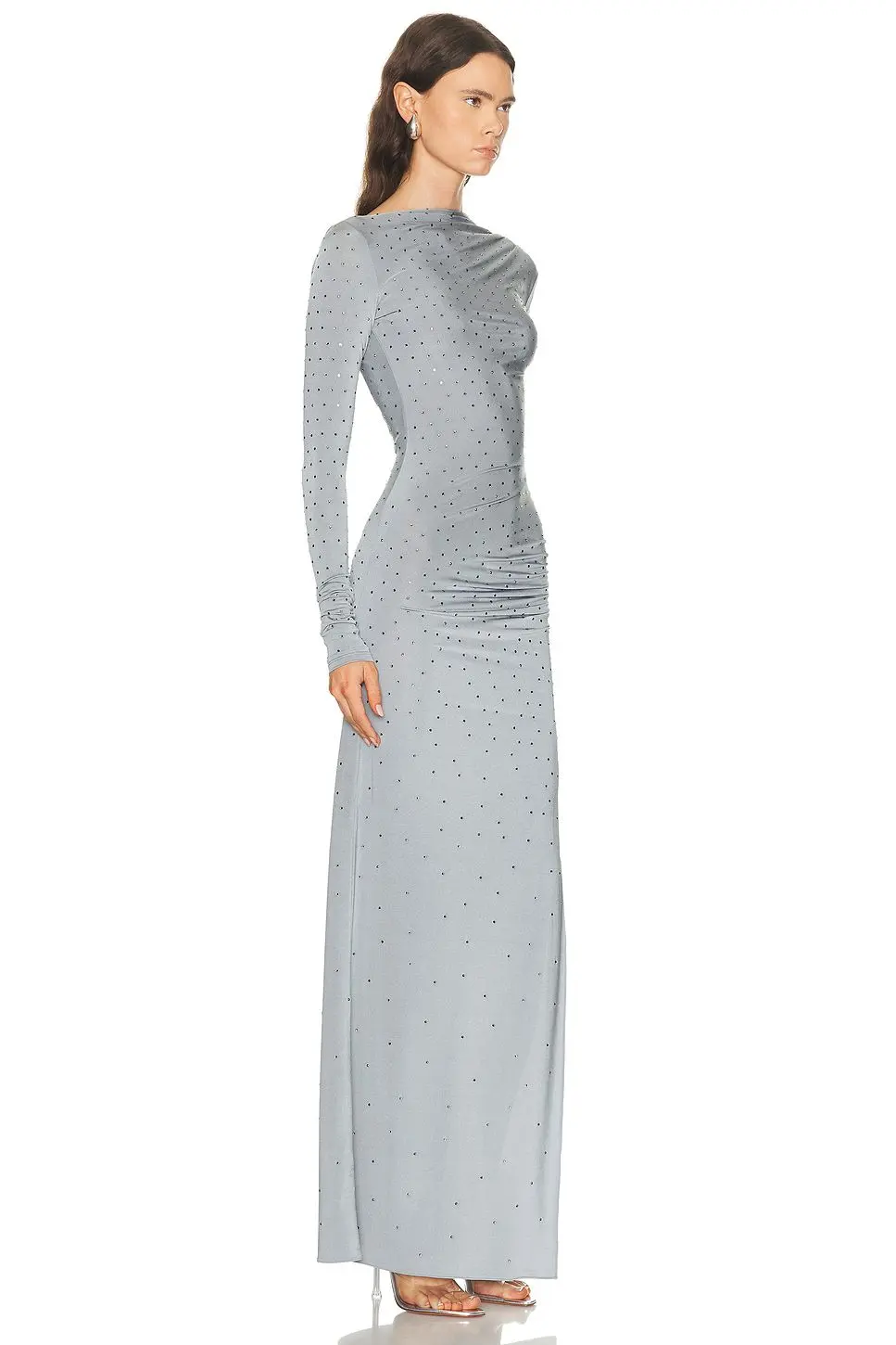 Boat neck maxi dress Details The Sophie maxi crystal dress is made from lightweight jersey. A dazzling piece decorated with all-over crystals, it features a high boat neckline that flows into an open back that drapes subtly to one side. The women’s maxi dress also features long sleeves and ruching at the side.