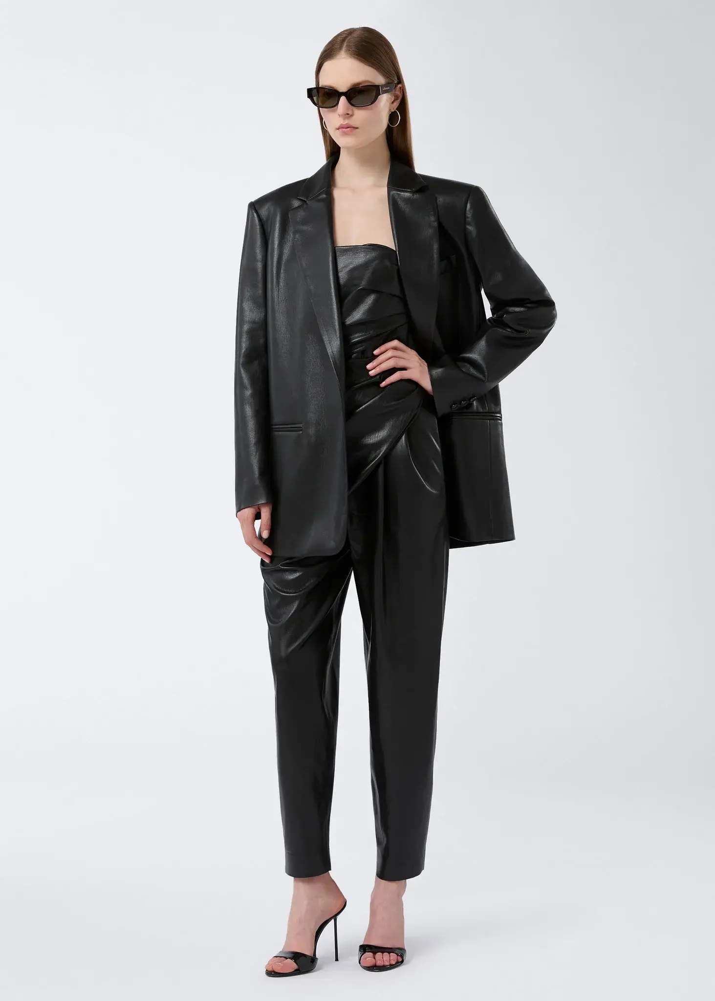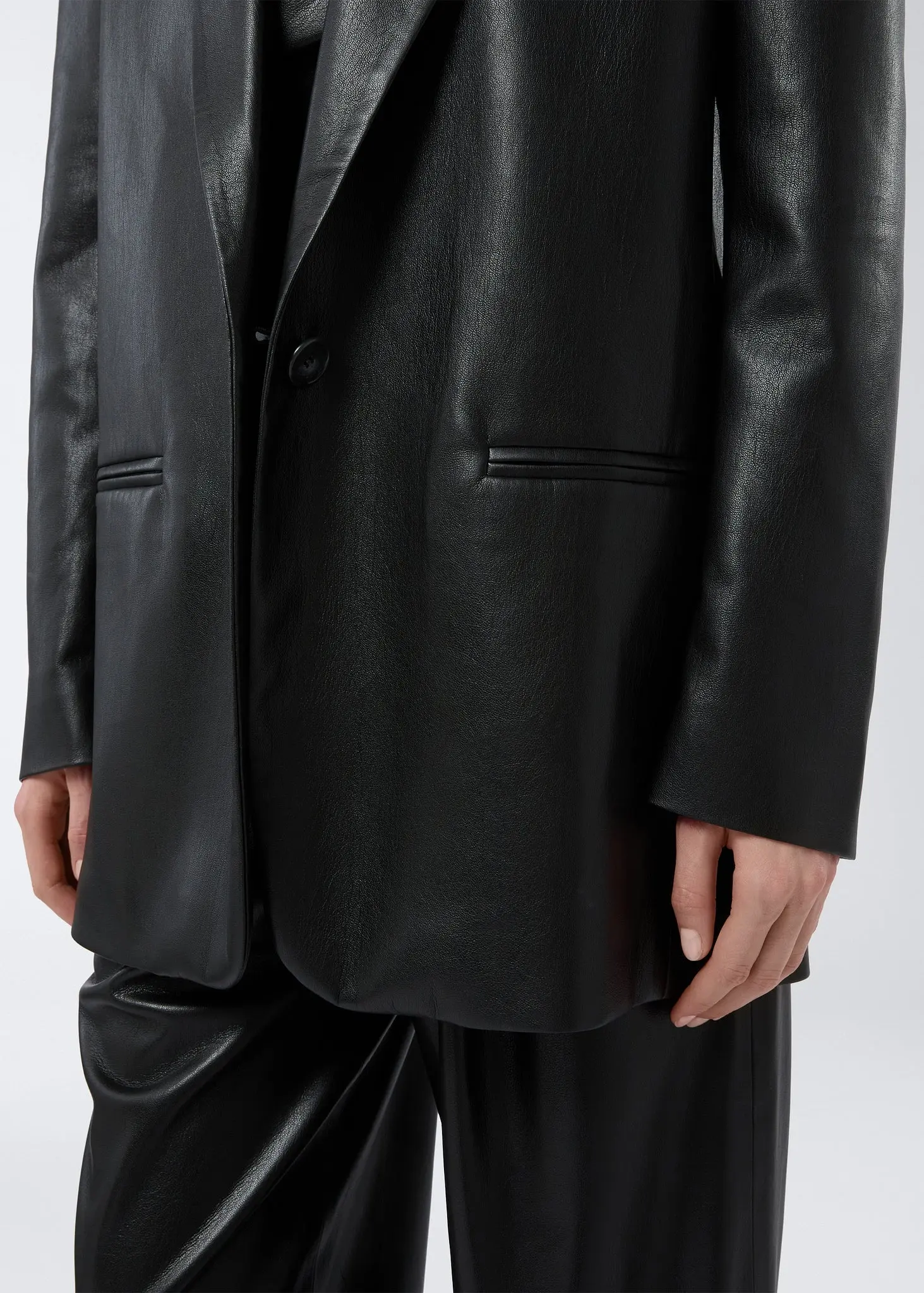Details The Guia oversized blazer is made from black vegan leather. With an ultra-soft composition, this women’s blazer is elevated with a welt pocket at the chest, two closed jetted pockets at the waist, and a back vent. With classic tailored features, it is defined by its notched lapel and single-breasted closure fastened with one button.