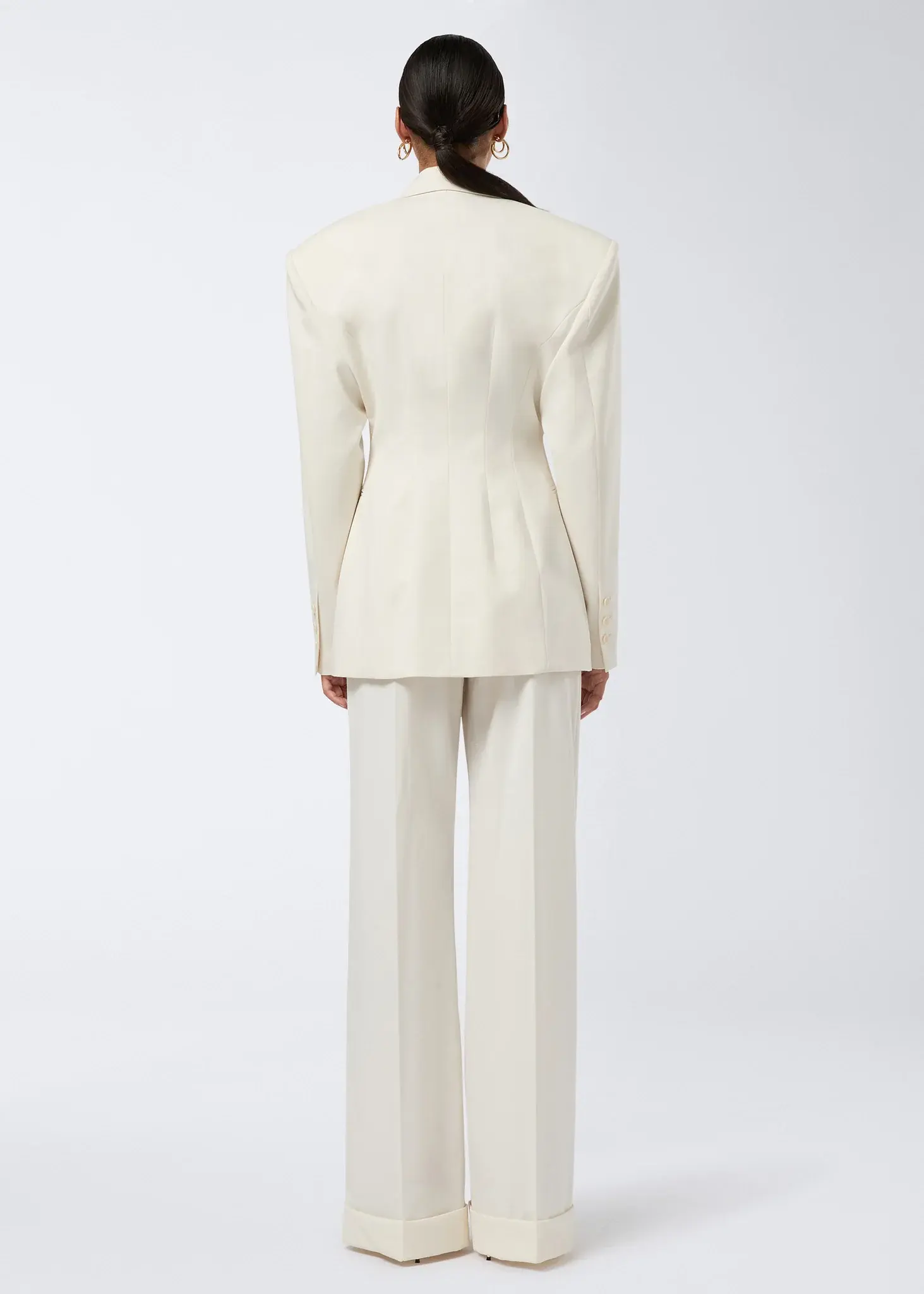 The Ottavia hourglass blazer is made from an ivory wool and gabardine blend. Extremely cinched at the waist, this women’s blazer is accented by its peaked lapel collar and single-breasted button closure. Tailored with two jetted pockets at the waist and three buttons on the cuffs, it features lightly padded shoulders to enhance the hourglass silhouette.