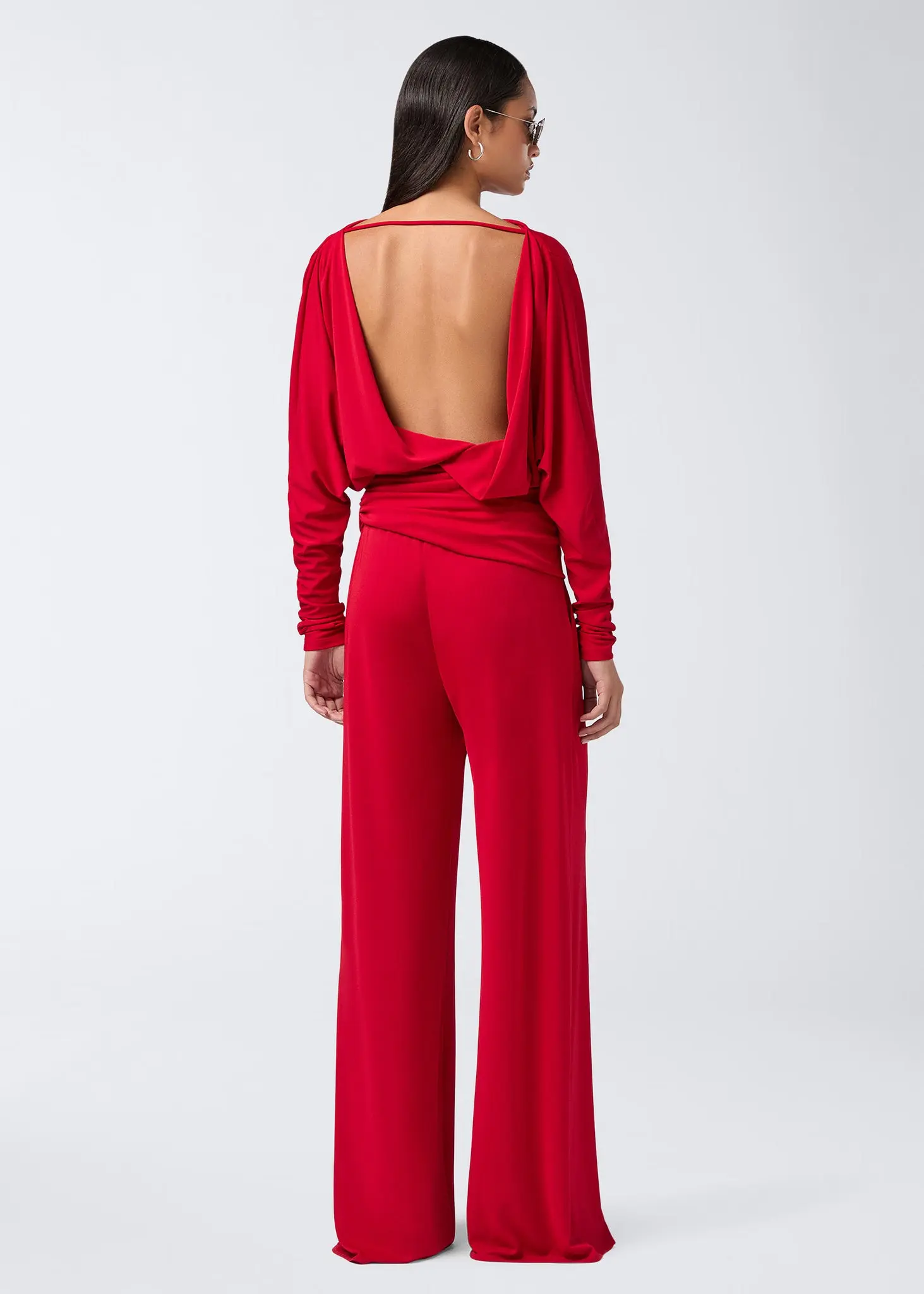 The Wisteria T-shirt is made from scarlet interlock jersey. Designed with soft, flowing lines to create a loose-fitting effect, this women’s top has a high boat neckline that extends into long sleeves. Contrasting with the bodice, this top is fitted around the waist and reveals an open back with a single connecting strap across the back of the neck.
