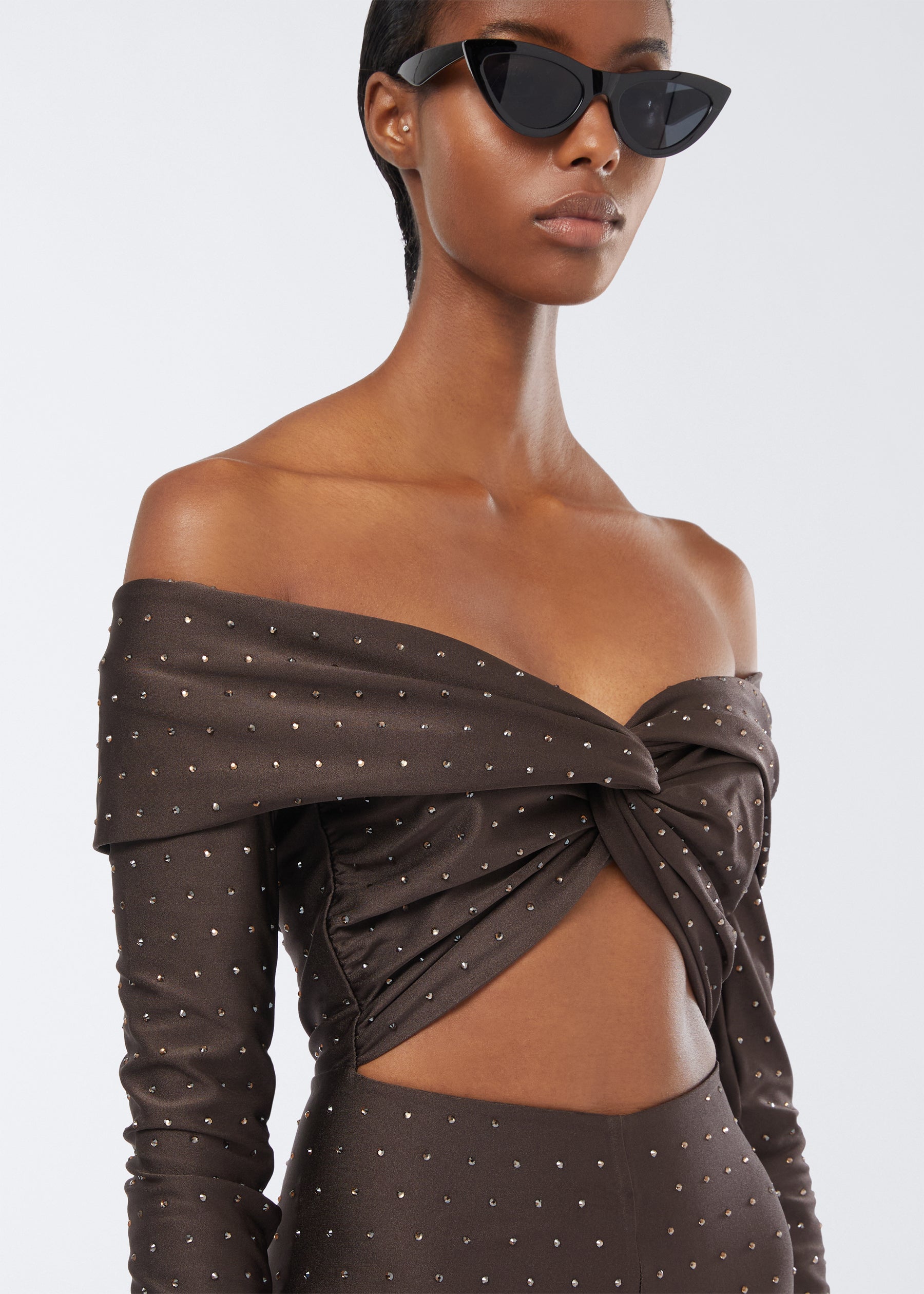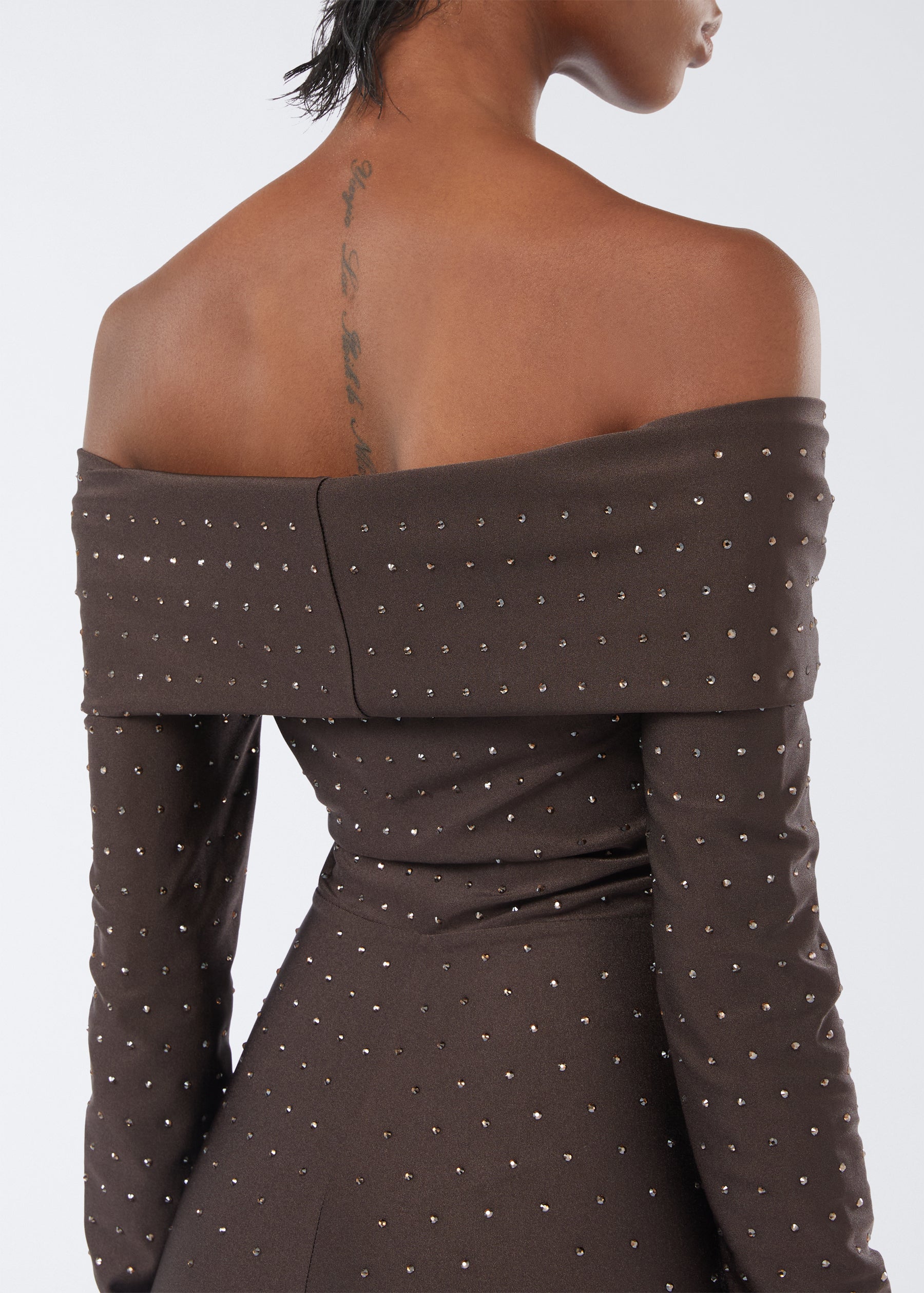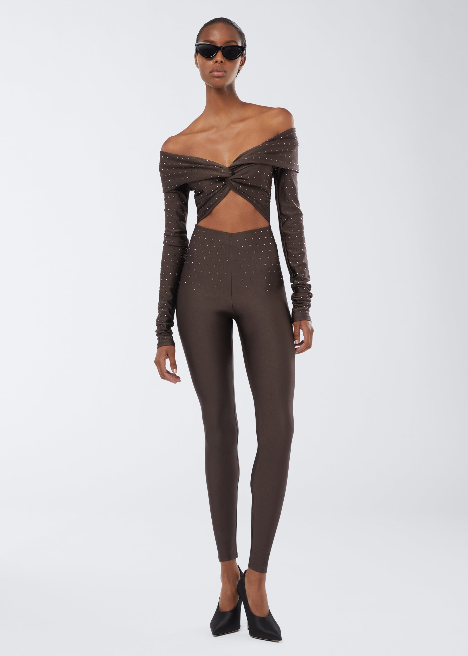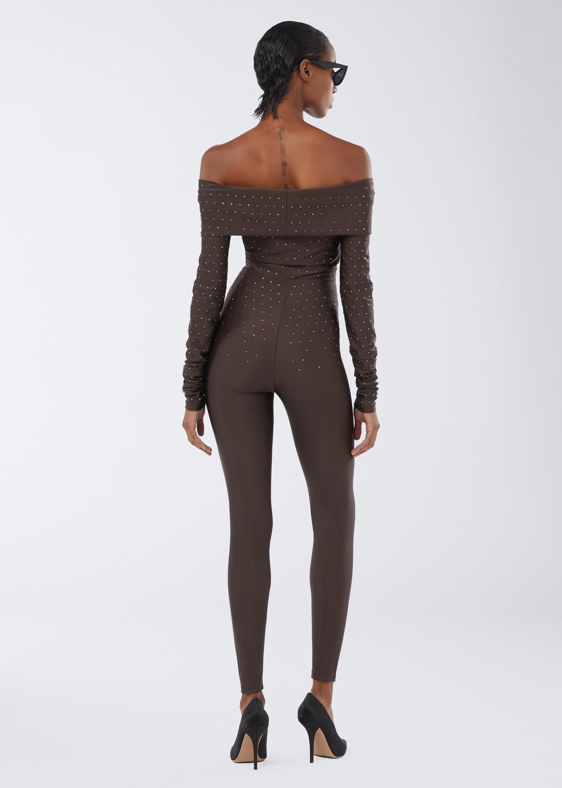 The Kendall off-the-shoulder women's jumpsuit in brown shiny lycra adorned with crystals features a plunging, off-the-shoulder neckline with a knot detail at the front. Enhanced by a triangular cut-out that accentuates the waist, the design is complete with long sleeves and tight-fitting leggings. Pair this lycra jumpsuit with crystal-studded brown mesh slingbacks to match, a plunging pendant necklace, and some stud earrings.