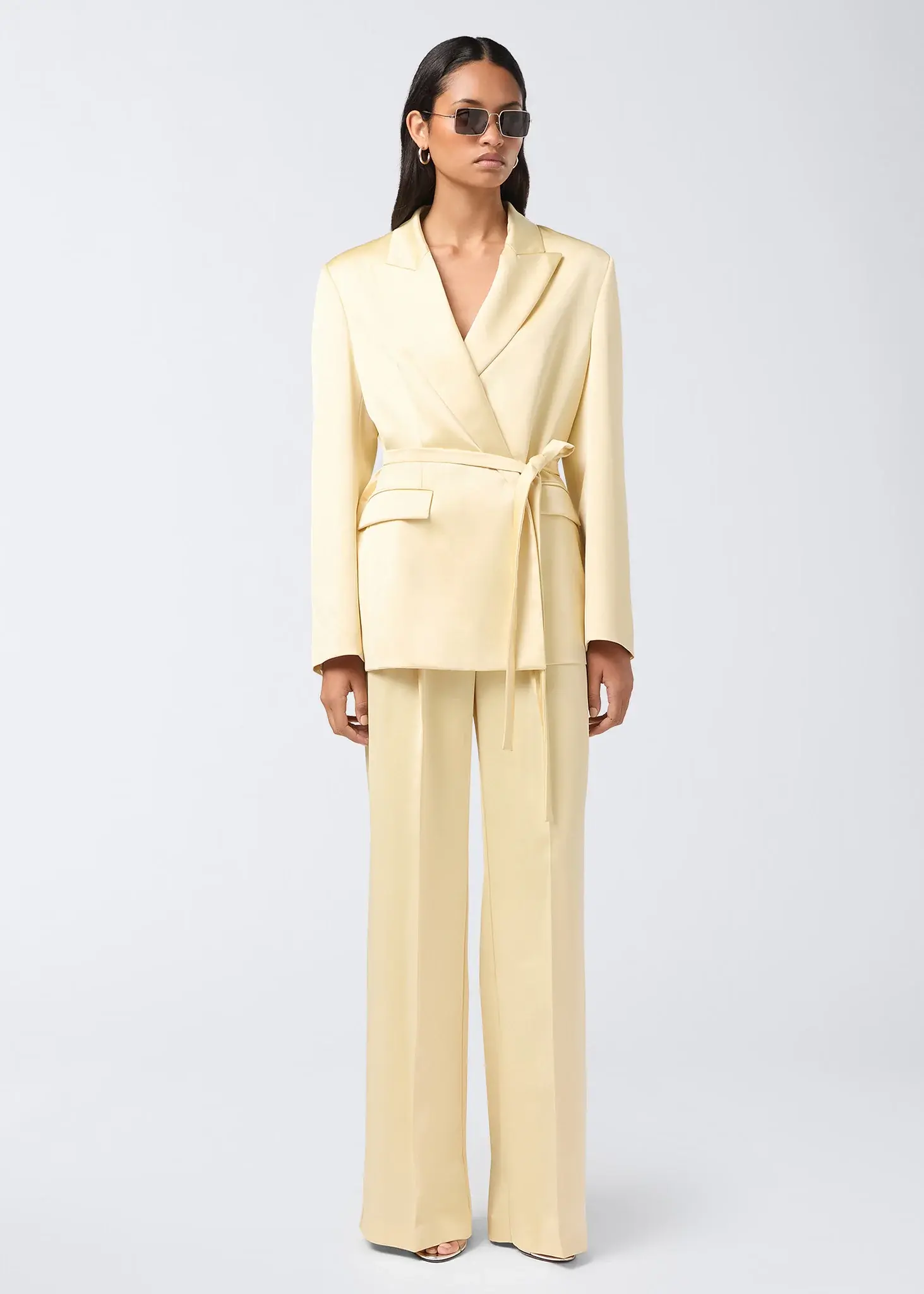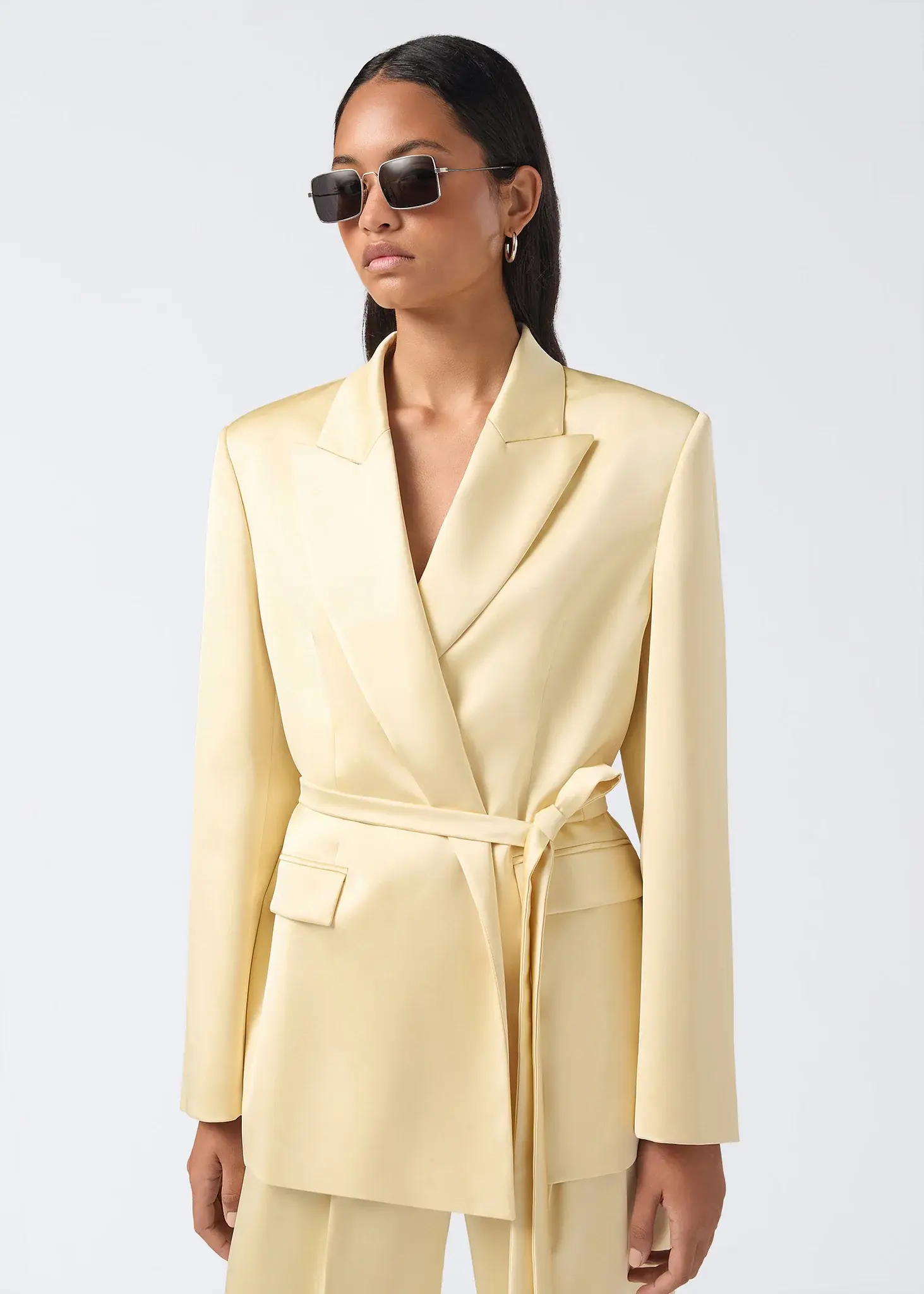 The Wilder blazer is cut from vanilla liquid satin. With a balanced silhouette shaped by padded shoulders and a matching belted waist, this women's blazer is defined by its peaked lapel. For a tailored finish, this blazer features two welt pockets with a flap at the waist and buttoned cuffs.