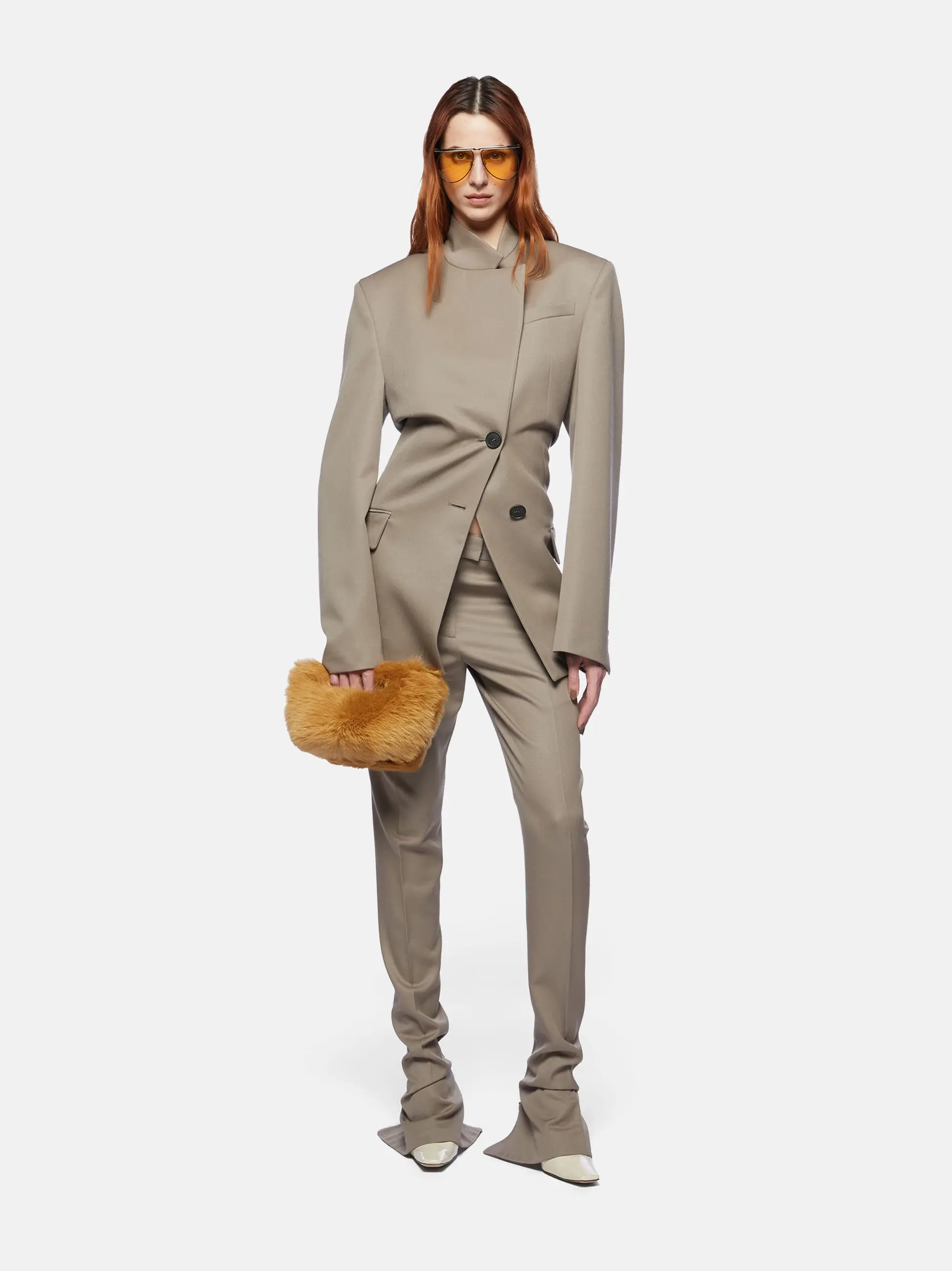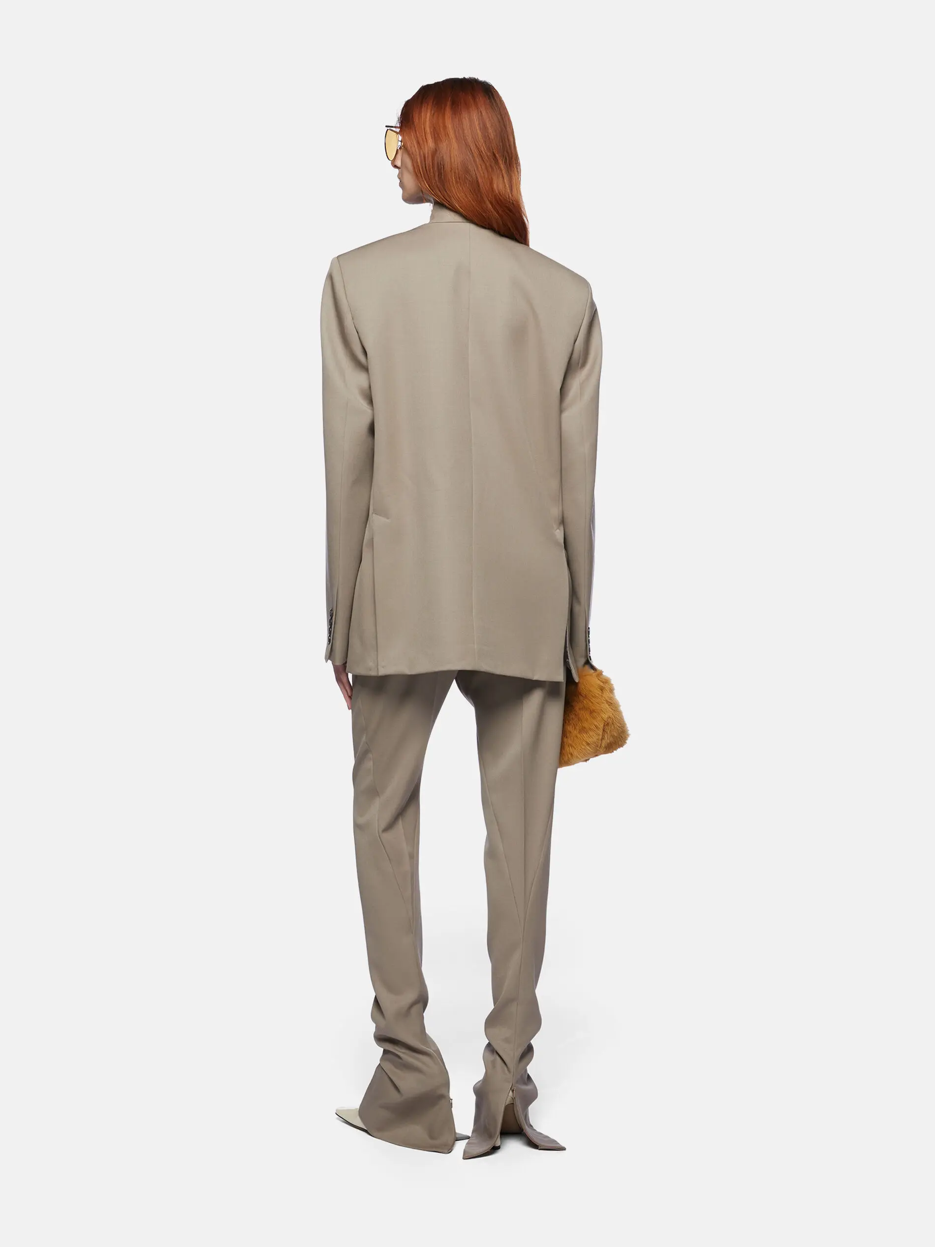 Low-waisted trousers in taupe gabardine with slightly flared bottom.
