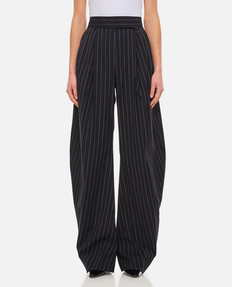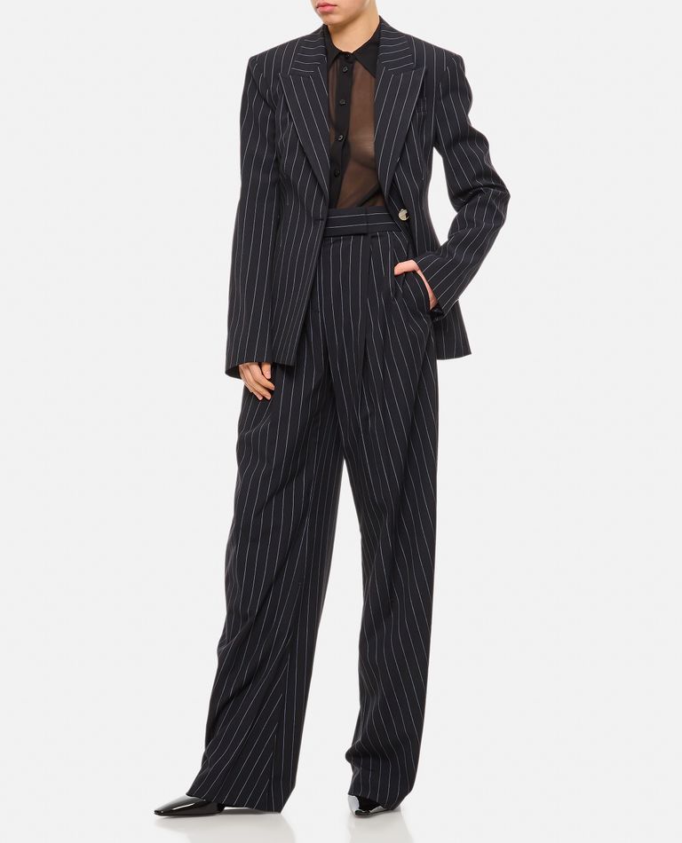 ▪Covered front closure, extended waistband tab with covered closure ▪High waist; Single front pleat ▪Side pockets, back welt pockets ▪Wide leg ▪Light blue pinstripe pattern ▪Relaxed, oversized fit ▪Color: navy blue/light blue ▪65% Polyester, 33% Viscose, 2% Elastane ▪Made in Italy