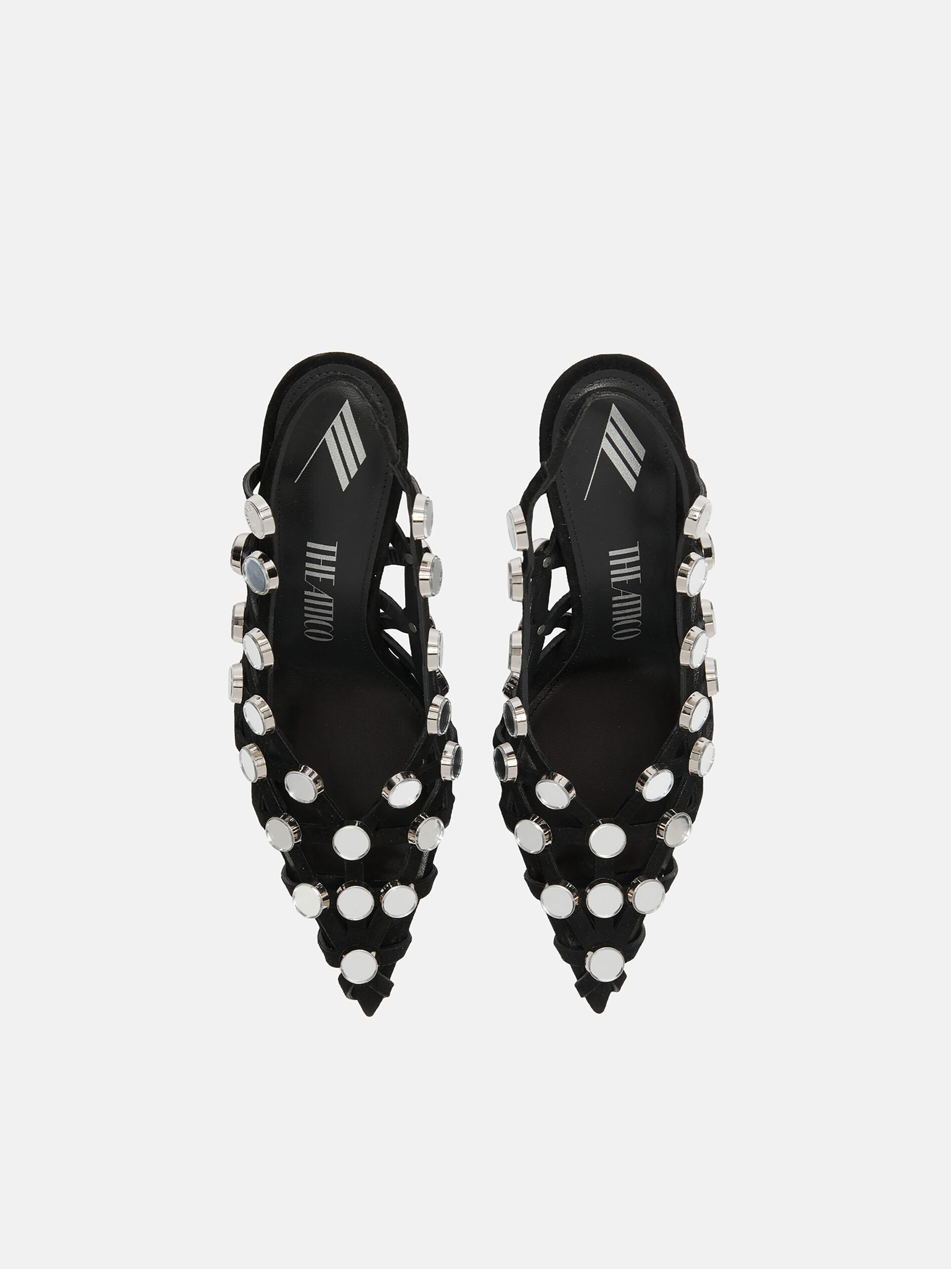 'Grid'' slingback in black suede with mirror application, height 105mm.