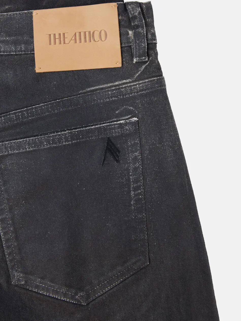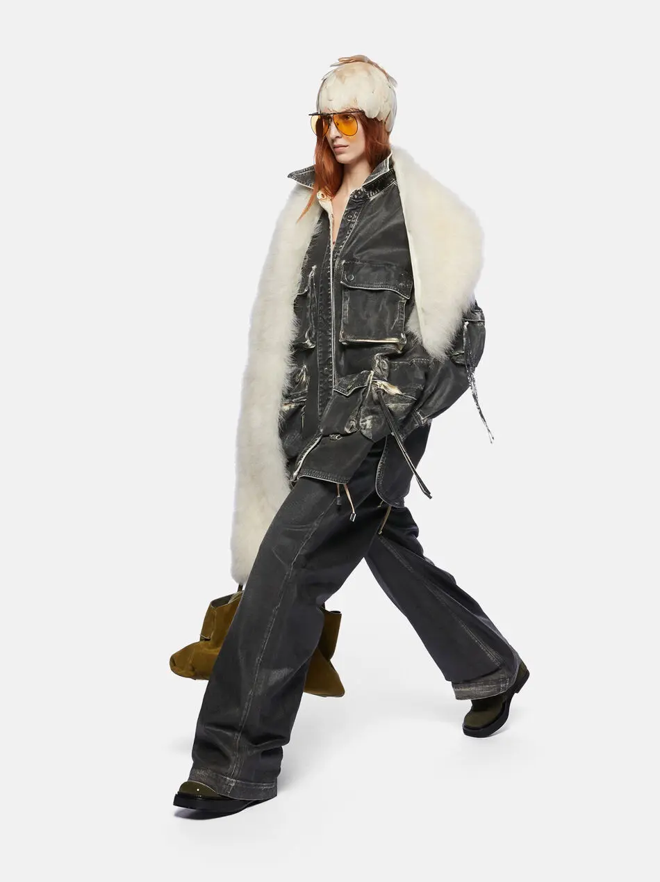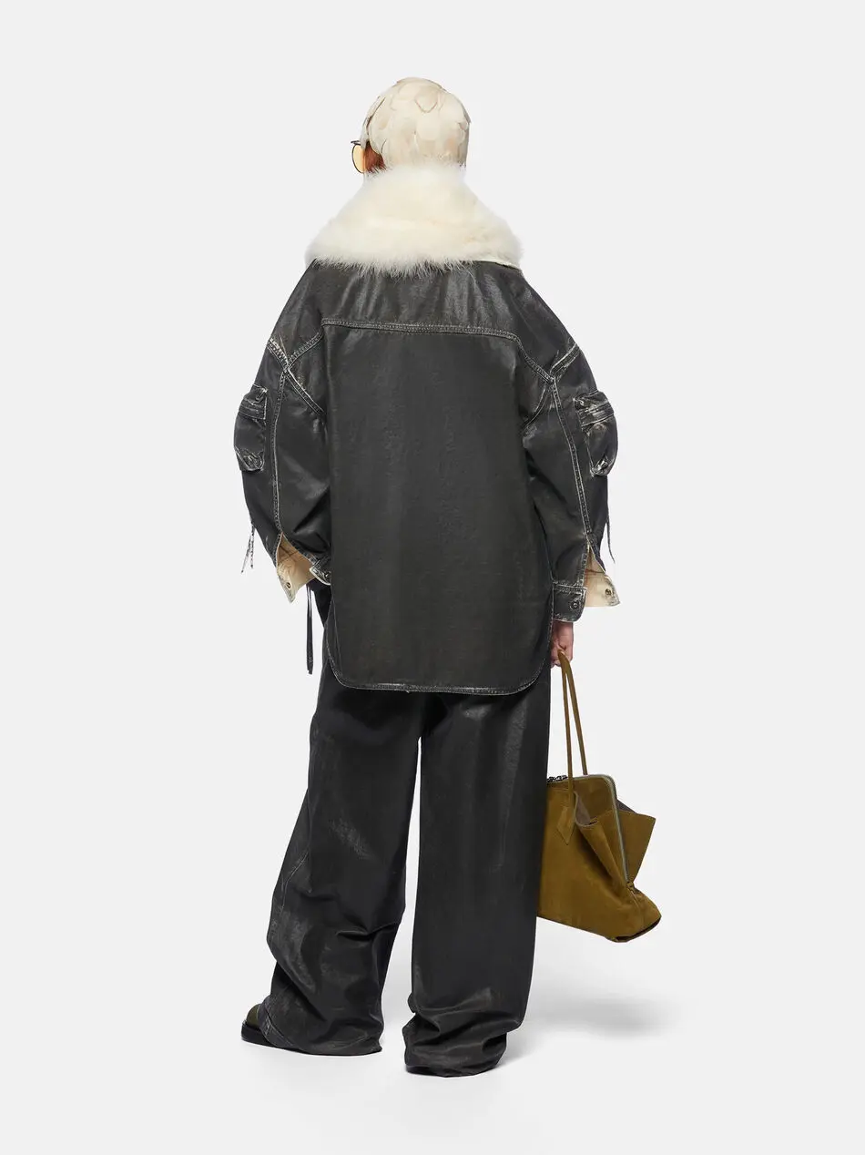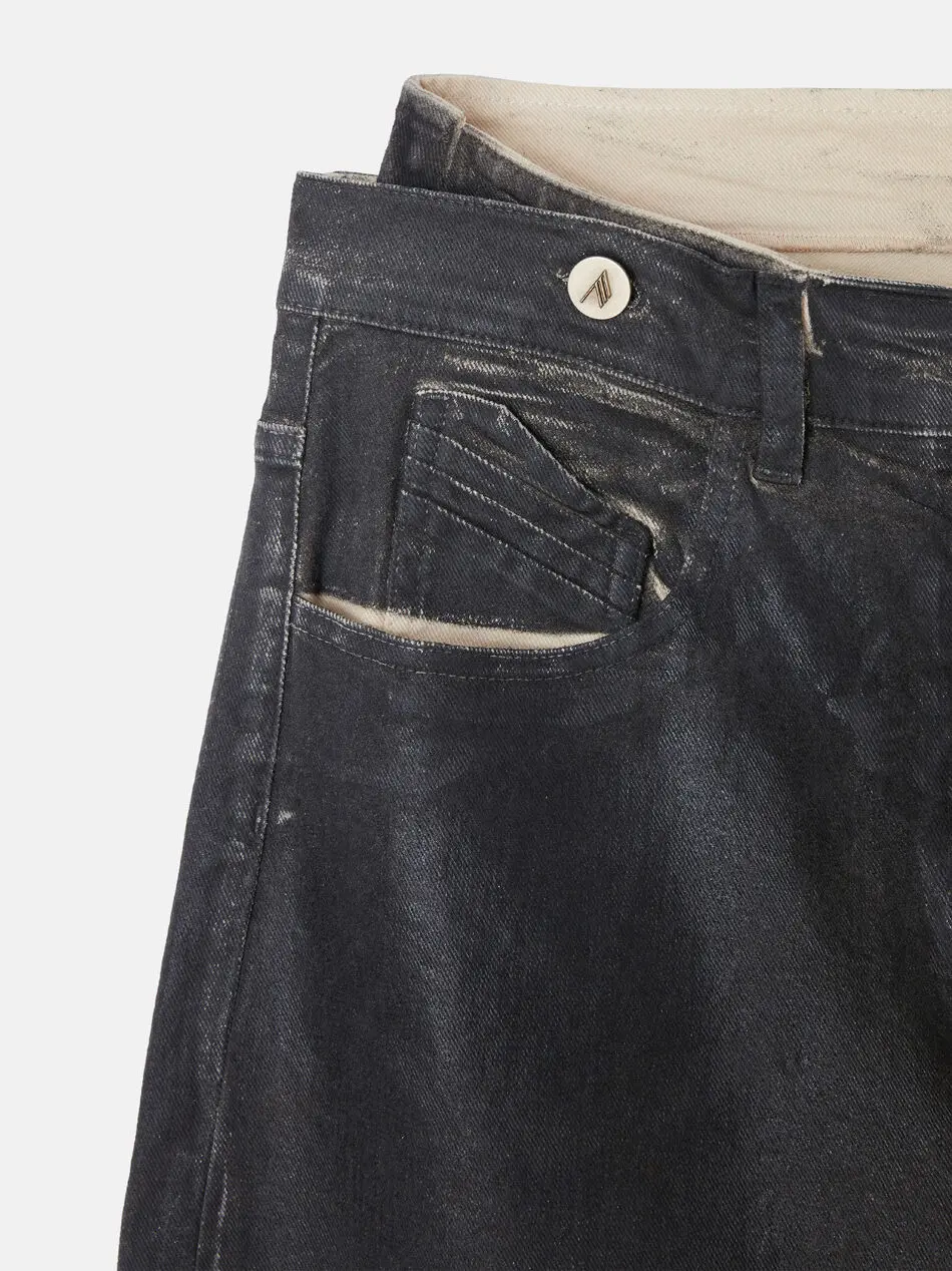 Long pants in navy blue mat coated canvas baggy with incorporated shorts and folded fifth pocket. Made in Italy.