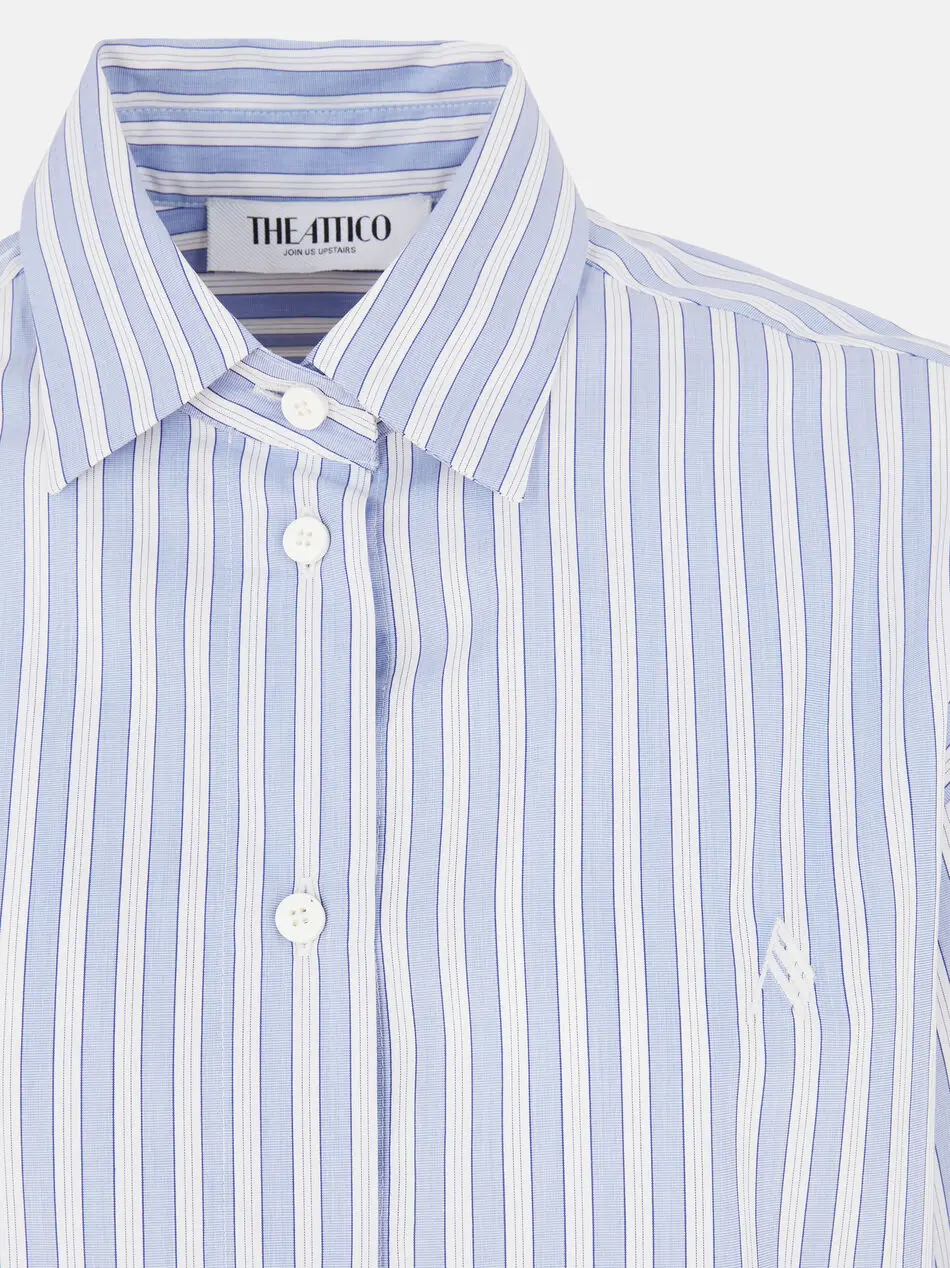 "Eliza'' shirt in light banana popleine with shaped split in white and navy blue striped cotton. Made in Italy.