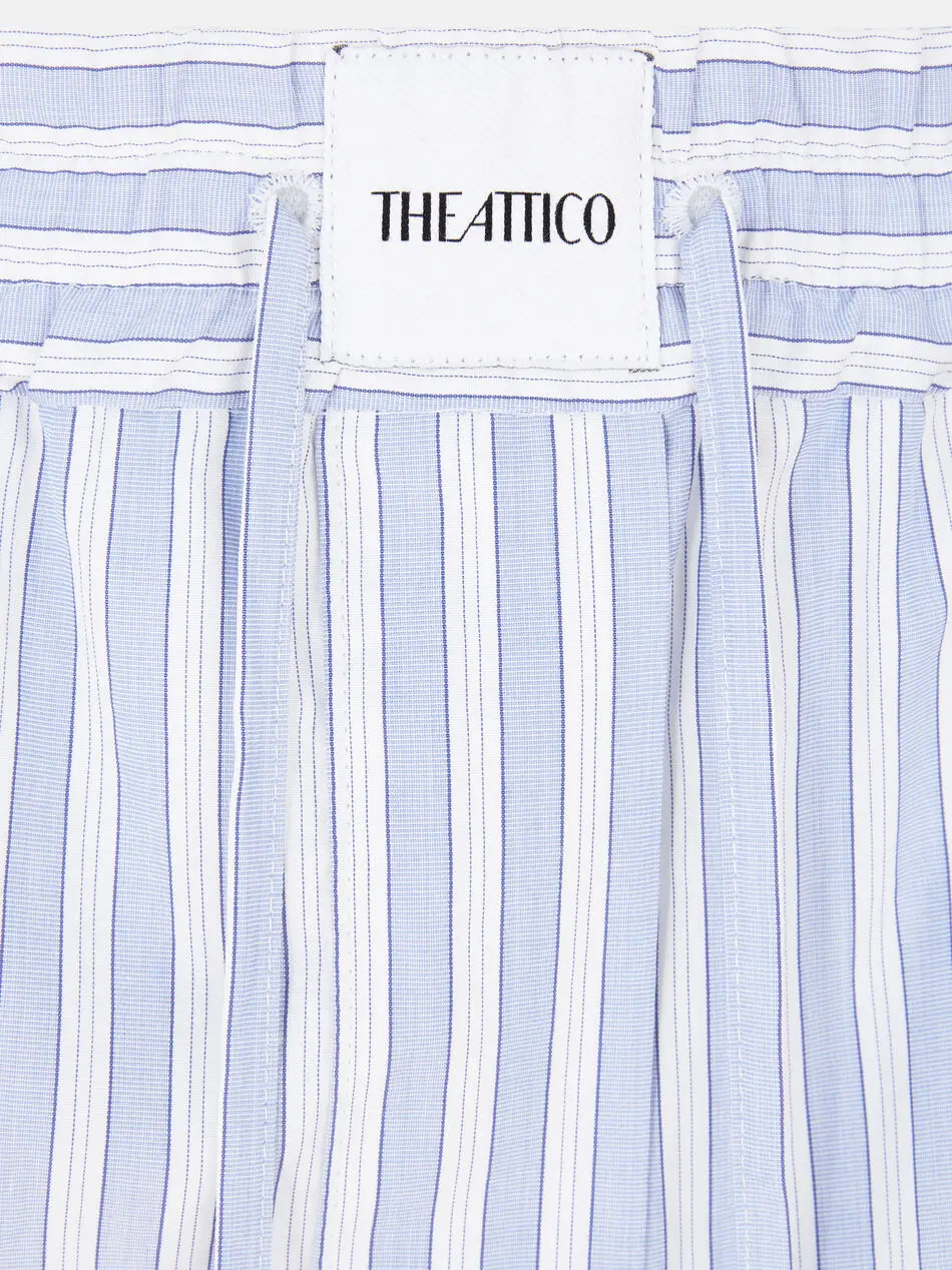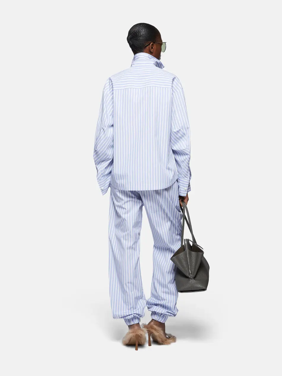 Long pants in white and navy blue striped cotton with wide leg and elastic at the bottom. Made in Italy.