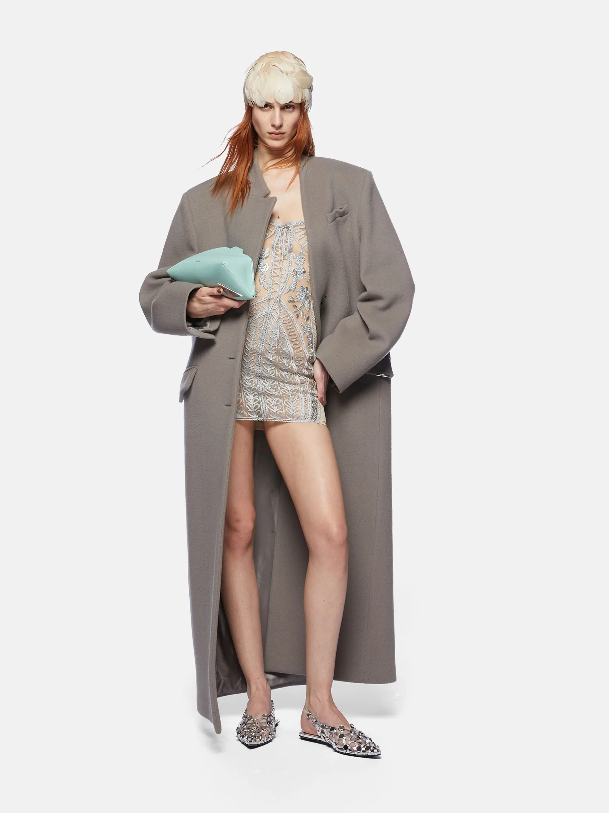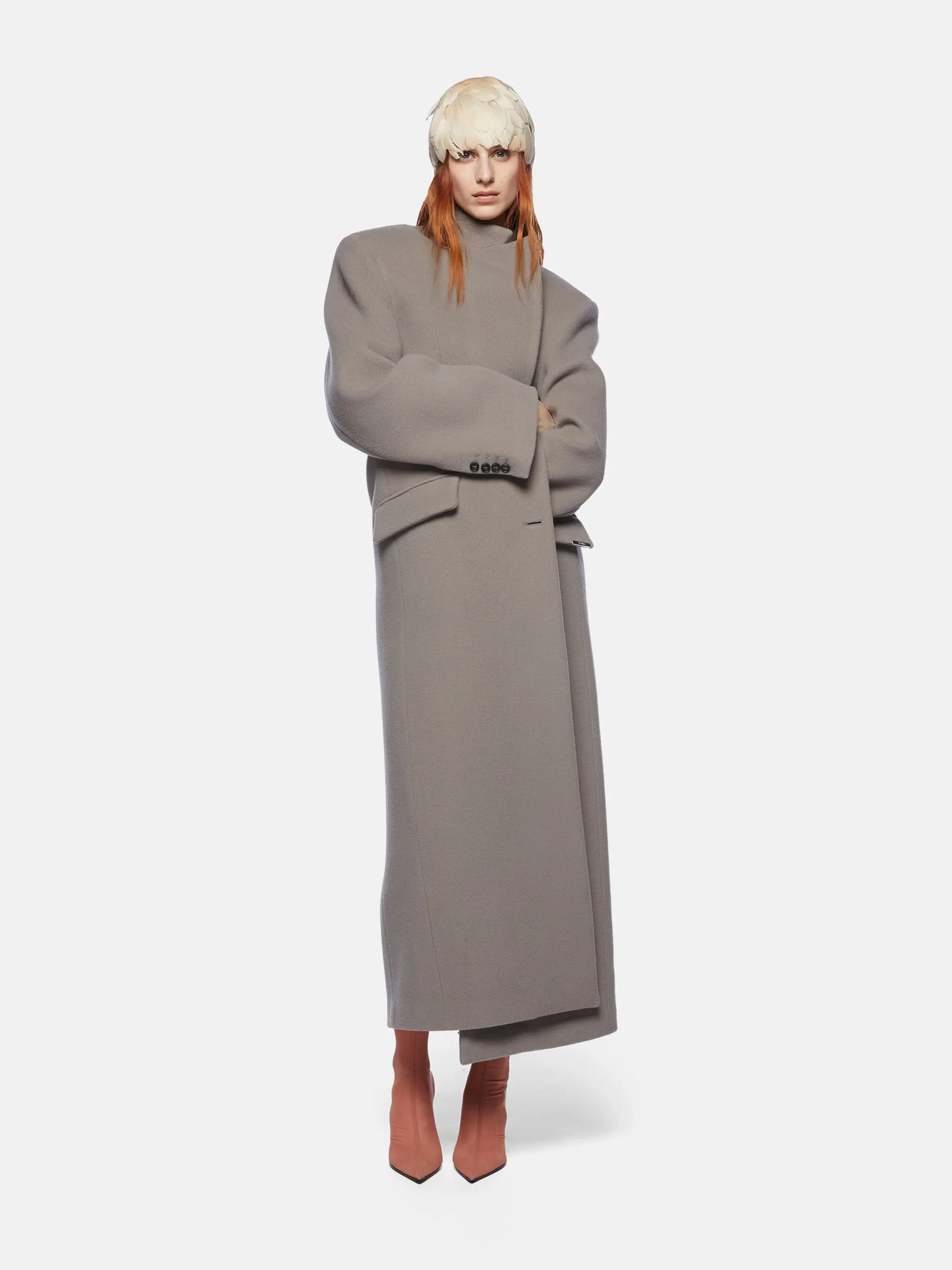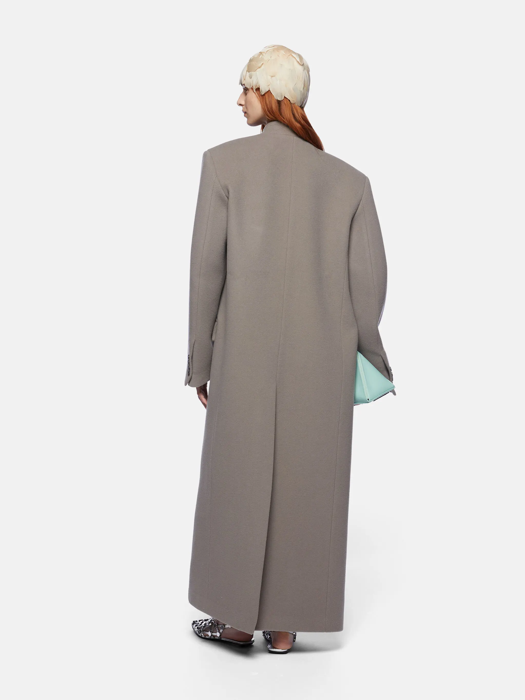 Single lapel long coat in grey twill wool cloth with buttons.