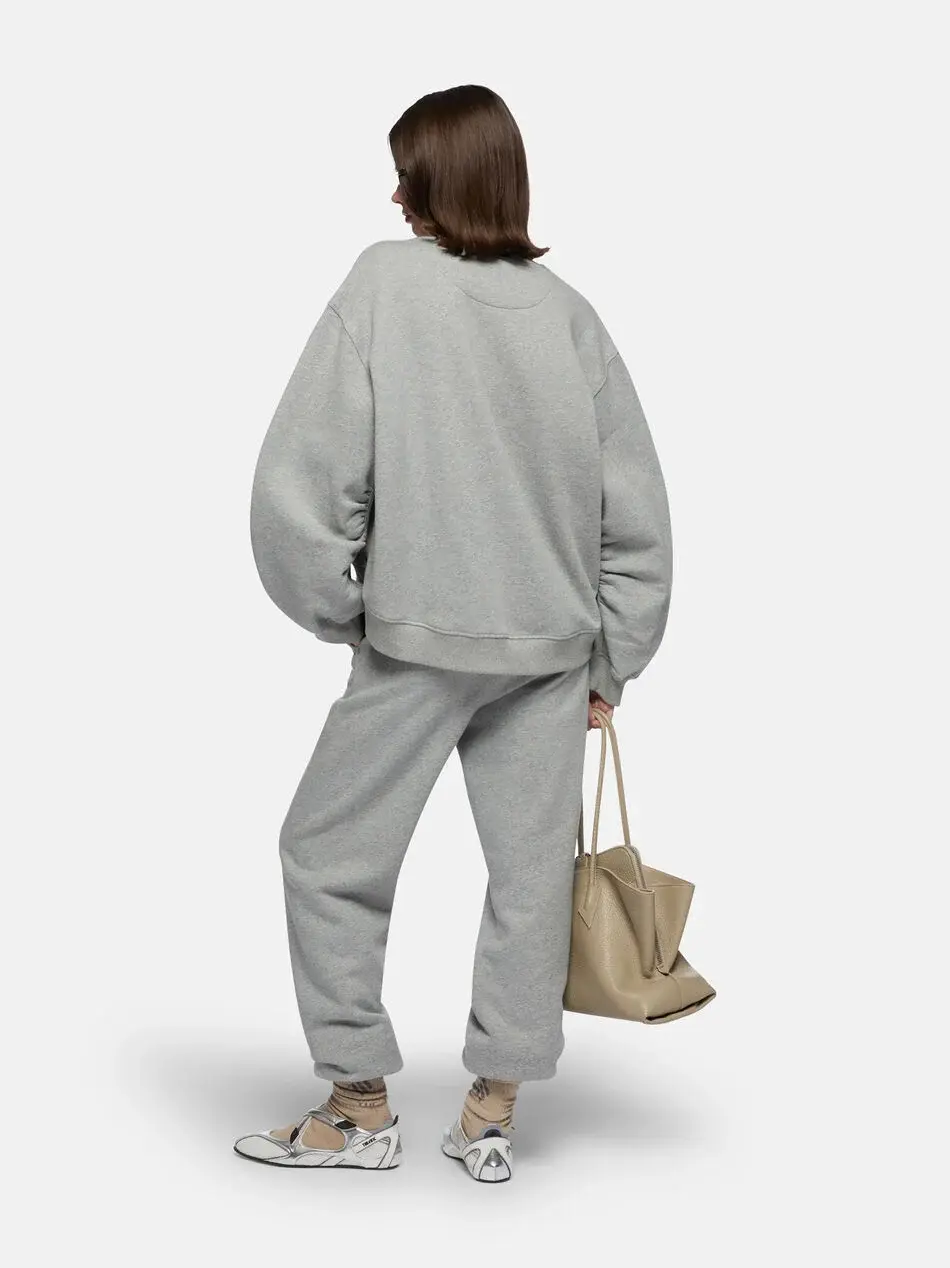 Oversize sweatshirt in faded grey melange brushed fleece with deep V neckline and color matching rubber label at center back. Made in Portugal
