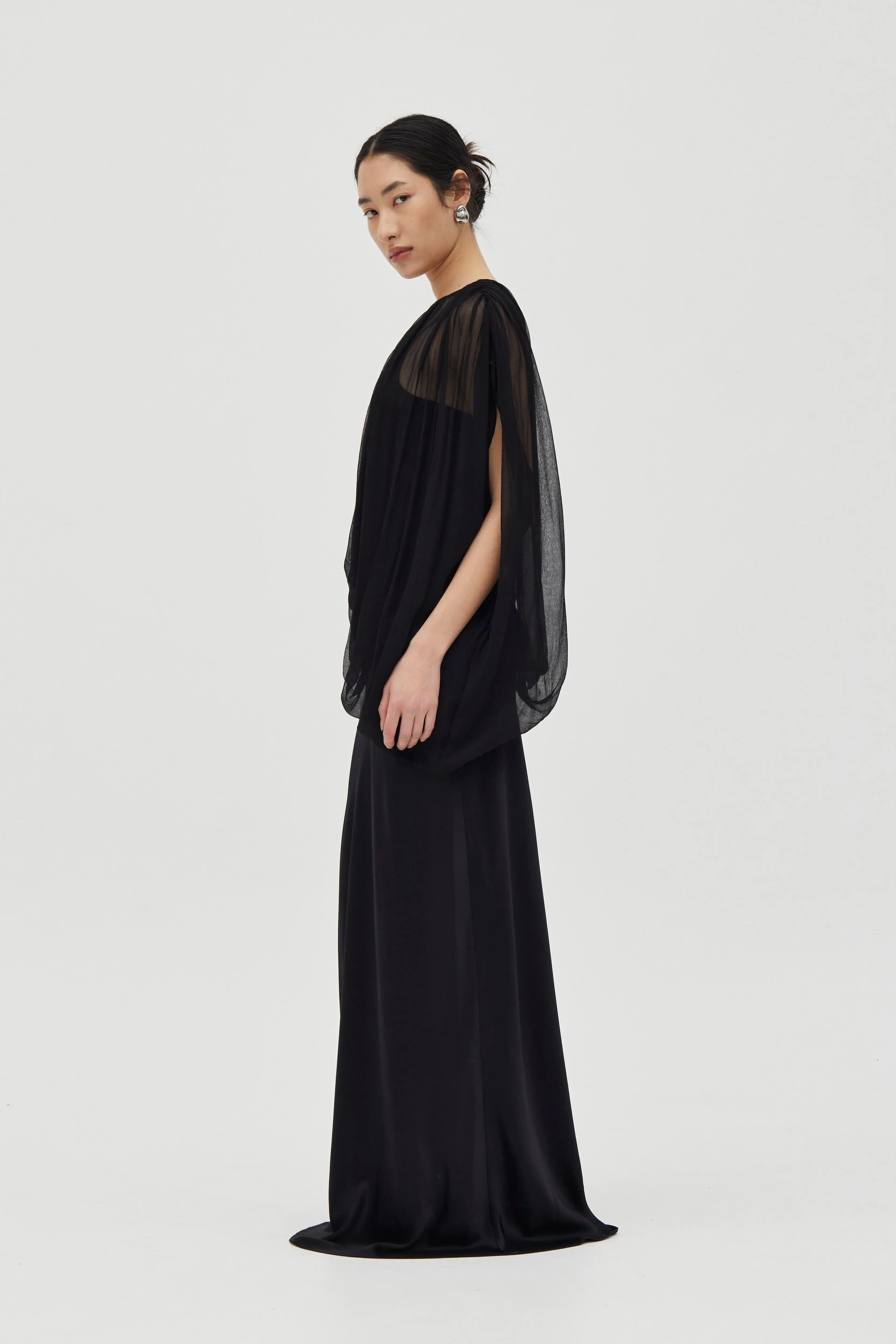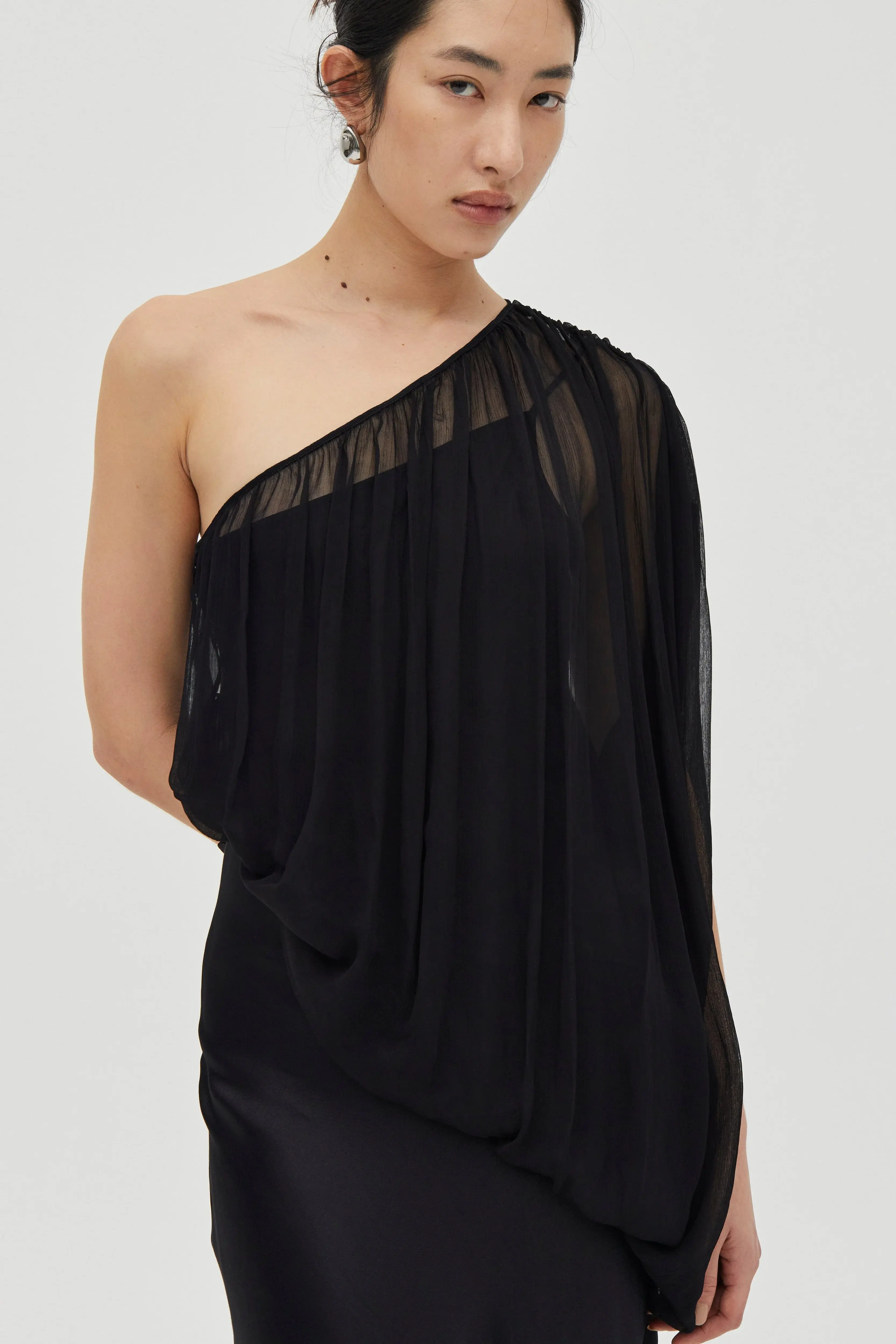 Floor length one shoulder dress Attached asymmetric chiffon billow overlay with subtle crinkle finish Overlay gathered through shoulder, neckline and waist seams Skirt is bias cut Bodice is lined; skirt is unlined Separate lining with adjustable strap Side invisible zip with hook and eye closure Fits true to size Length: 146.5cm Mali is 177cm tall and wears a size US 4 (83cm Bust, 65cm Waist and 97cm Hip)