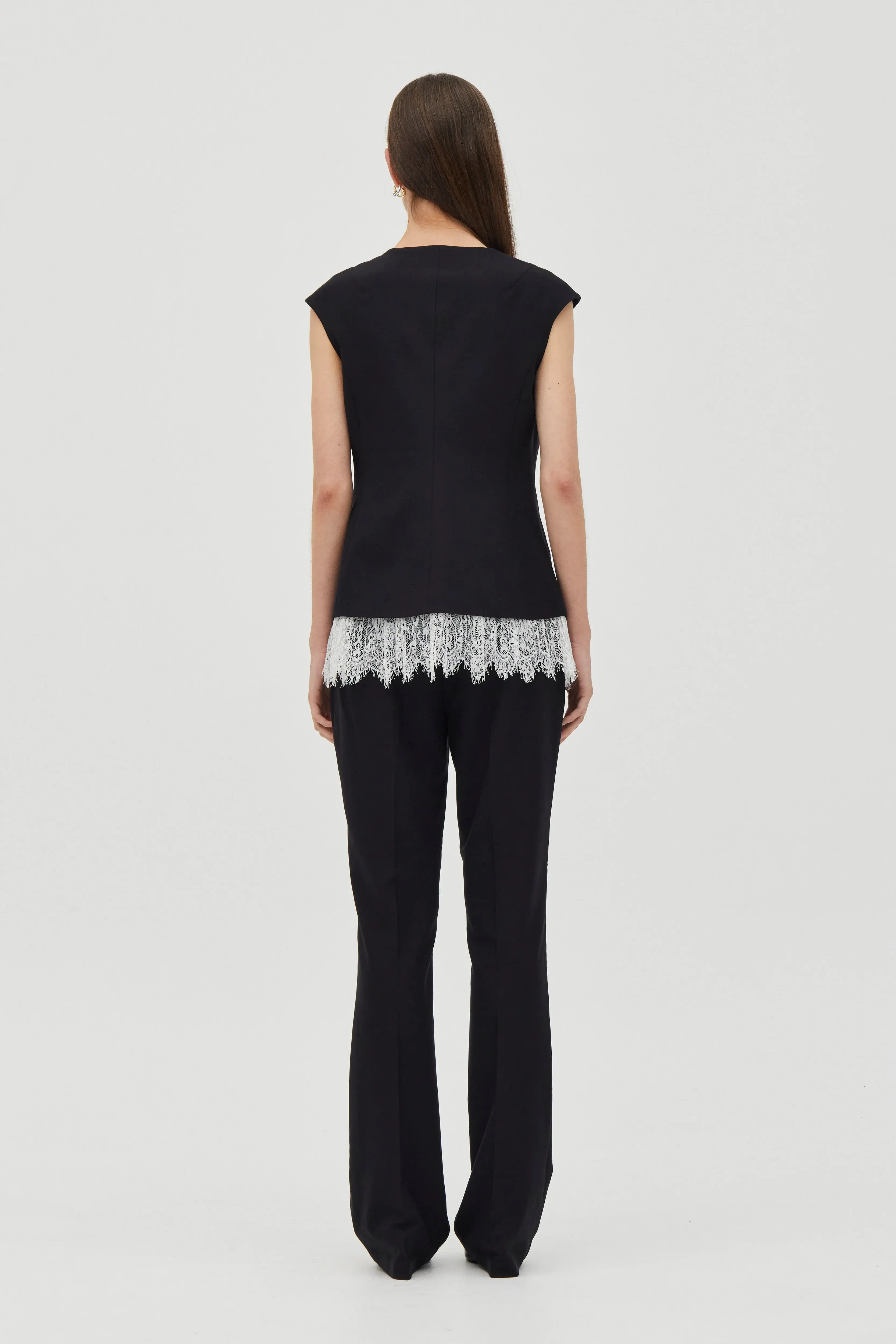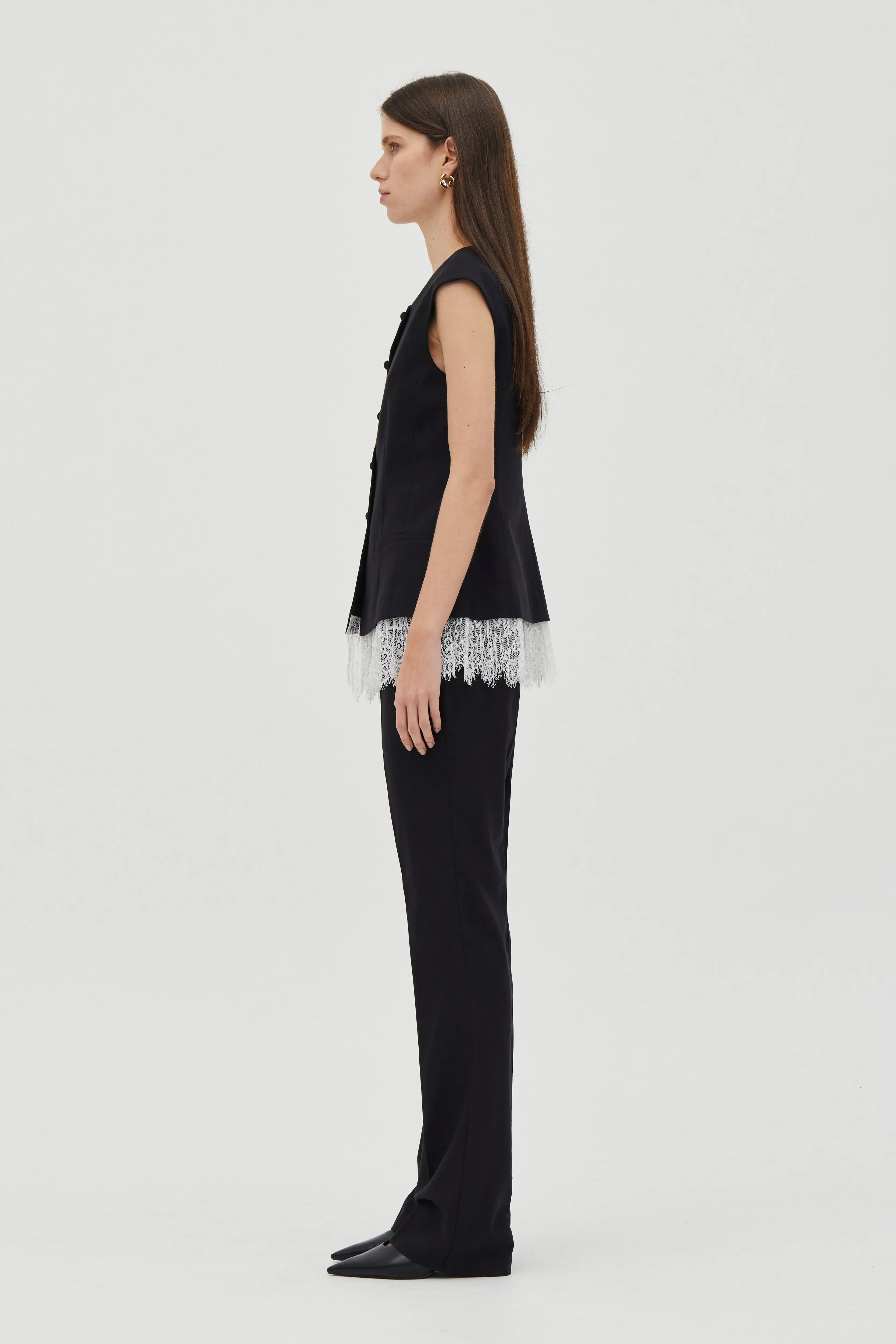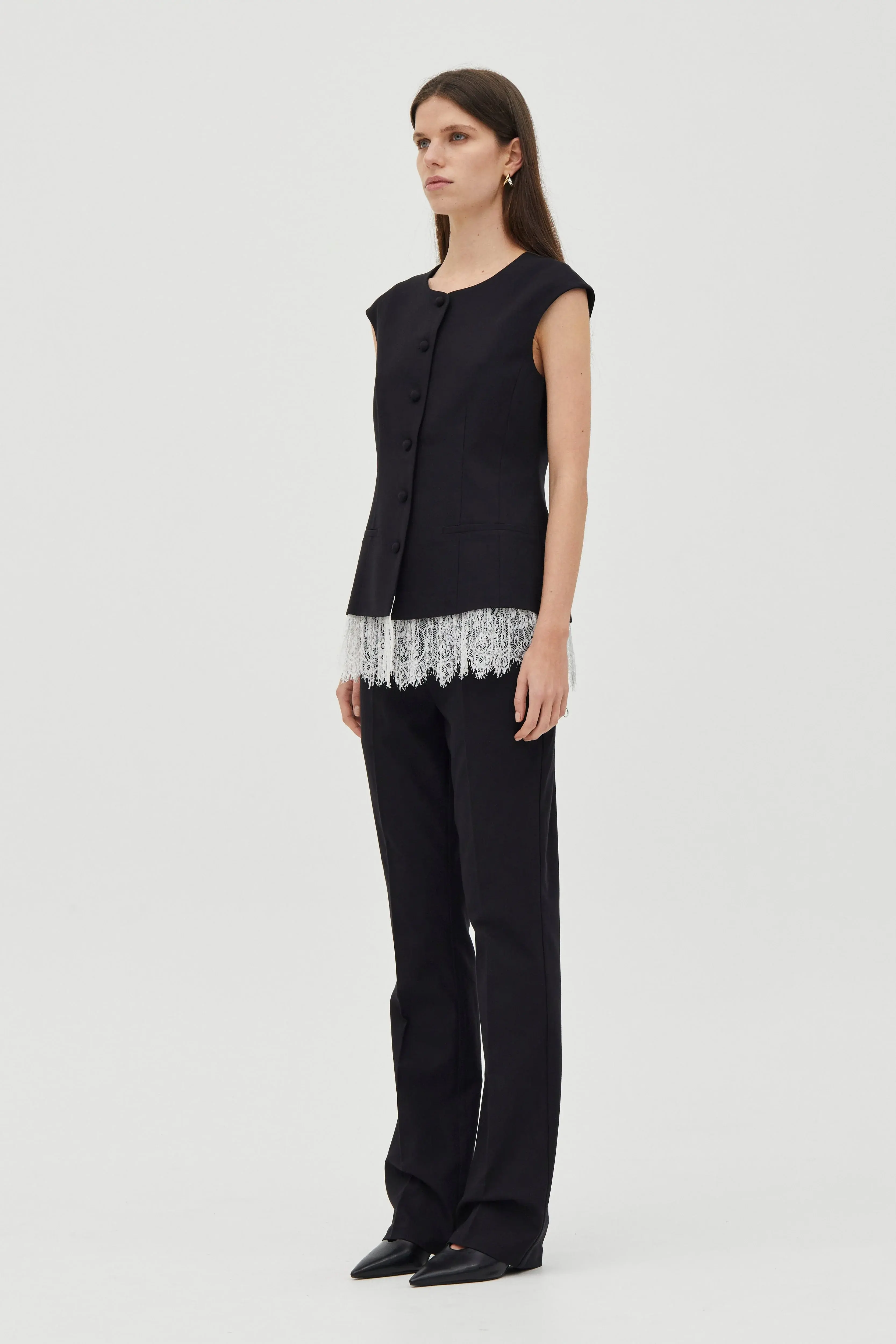Lace trim vest with soft round neckline Tailored fit with a structured silhouette Centre-front fastening with self-covered buttons Pleated lace trim hem Single welt pockets Fully fused body for structure Fully lined Fits true to size Length: 61cm Liv is 179cm tall and wears a size US 4