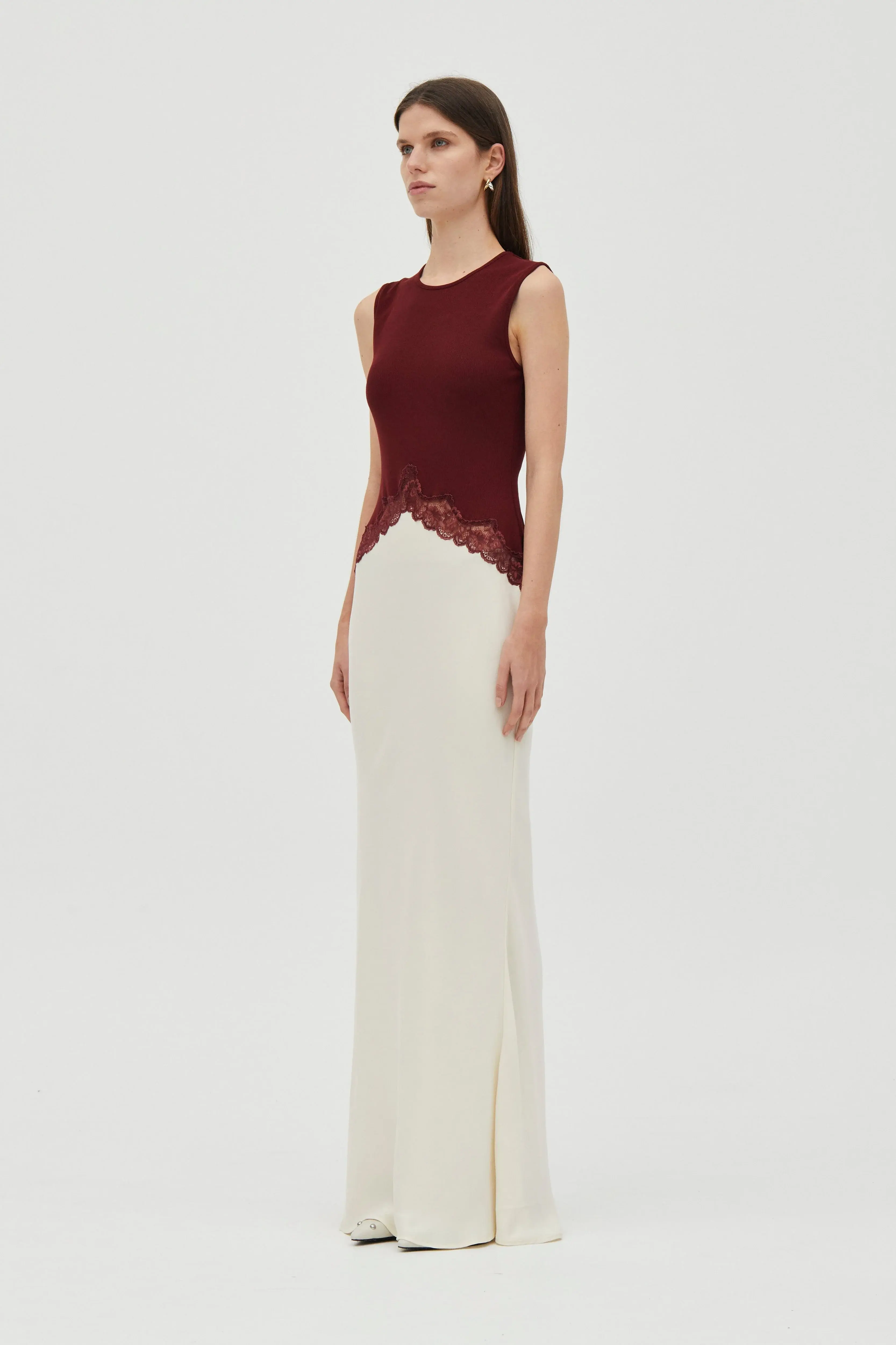 Product Features & Fit Fitted tank bodice with ribbed jersey fabrication Sheer lace panel detailing through the waist Bias-cut lower skirt Floor-length silhouette Slip on and wear Unlined Bra friendly Fits true to size Length: 143cm Liv is 179cm tall and wears a size US 4