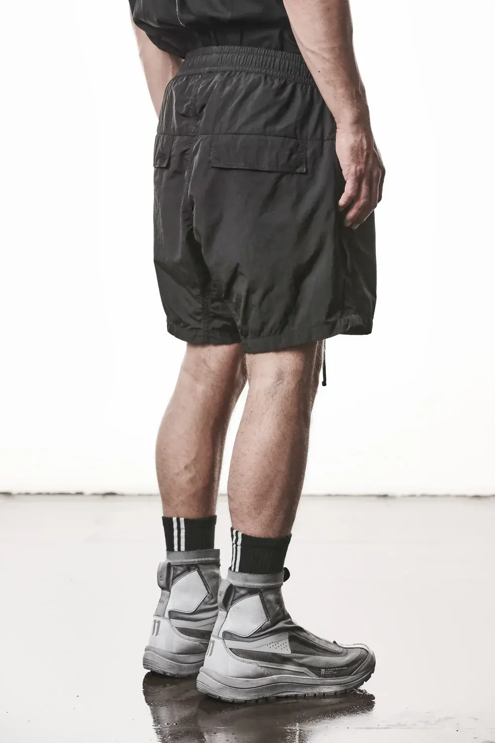 drop crotch shorts elastic waistband with drawstrings hidden zip pockets in front flap pockets at backside safety inside pocket technical polyamide fabric