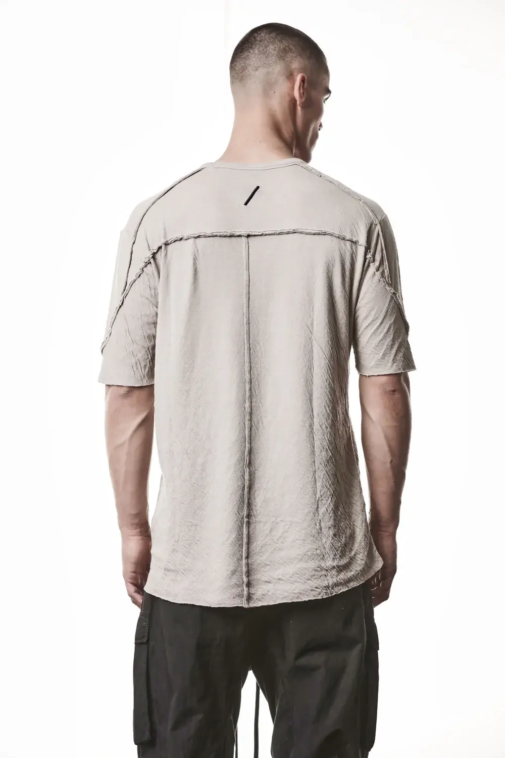 round neck shirt slim fit raw cut hem cut seams outside 'slash' logo stitching light crashed bonded cotton fabric