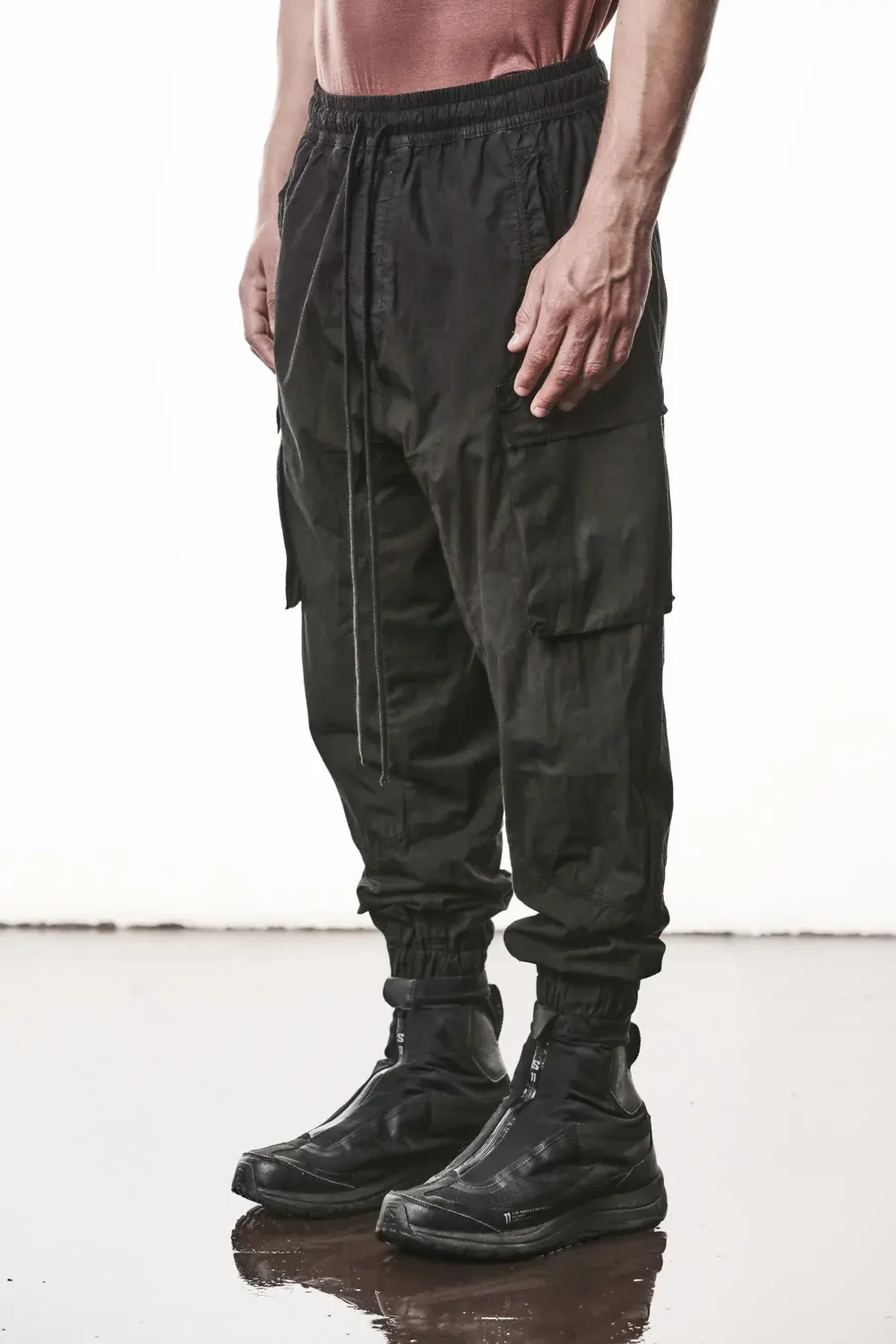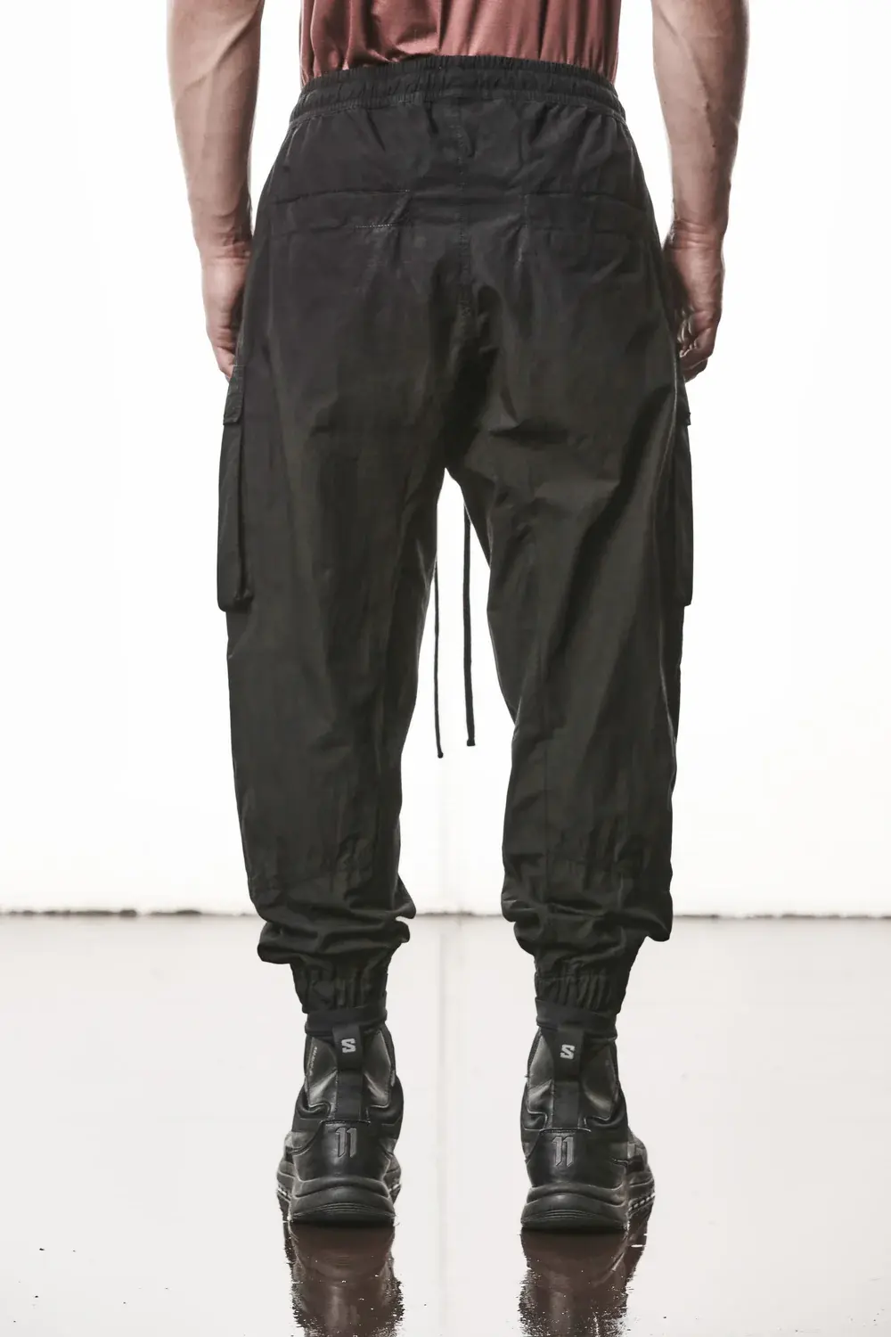 woven cargo trousers elastic waistband with drawstrings cargo pockets at leg zip pockets in front safety inside pocket organic cotton