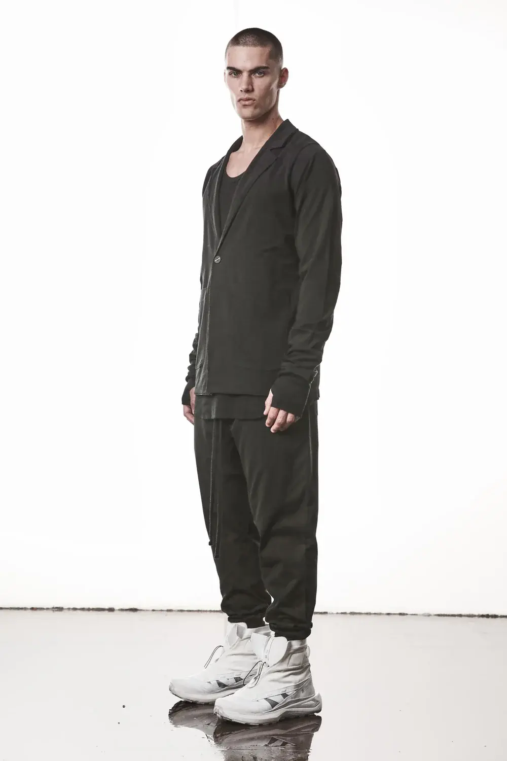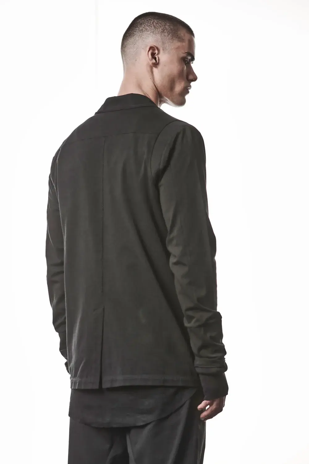 one button blazer rib cuffs and inserts at shoulder cotton strech jersey