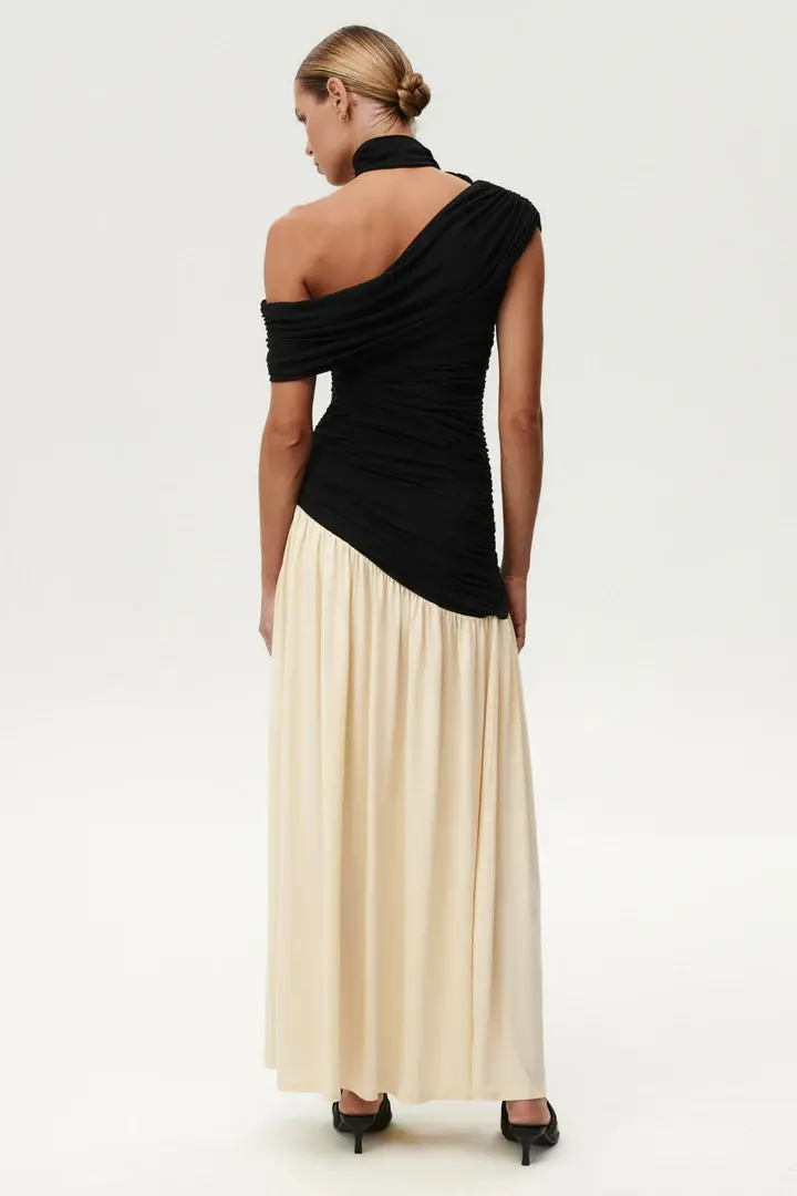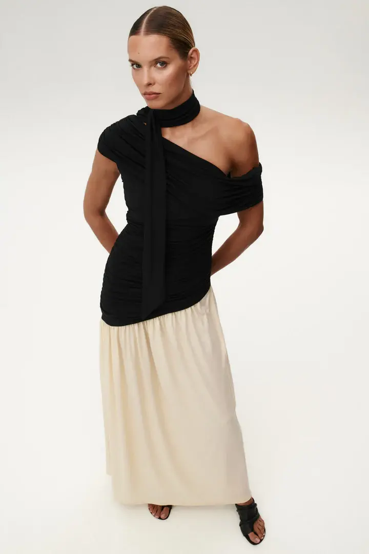 The entire design is defined by ruching. On the black upper part, horizontal gathers flow from the side seams, shaping the body. The blonde part features vertical ruching that falls from the diagonal seam, adding movement to the look. Asymmetry gives the dress its character. The waistline is cut on a slant, one shoulder is exposed and a draped, ruched scarf detail wraps across the shoulders. A zipper is placed at the center back. This dress comes with a separate scarf, fastened with a single snap, allowing for versatile styling. Elegant, feminine, and made to stand out. A striking choice for weddings and summer celebrations.
