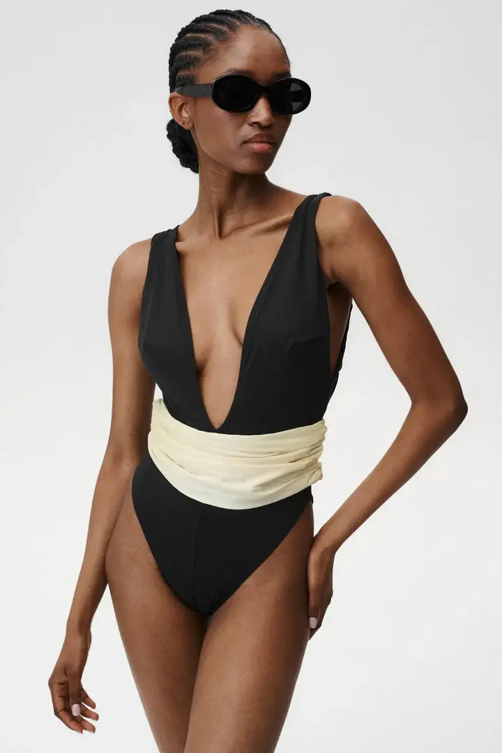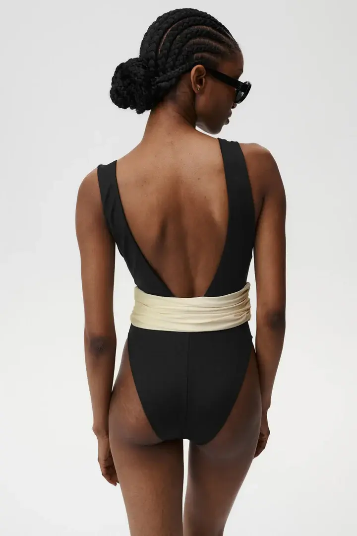 Aura Swimsuit captures an effortless blend of classic elegance and modern charm. With its deep, sophisticated neckline and beautifully draped contrasting sash at the waist in butter yellow color, perfectly highlights your figure and enhances your natural glow. Aura is designed for women who embrace their femininity and elegance with confidence.
