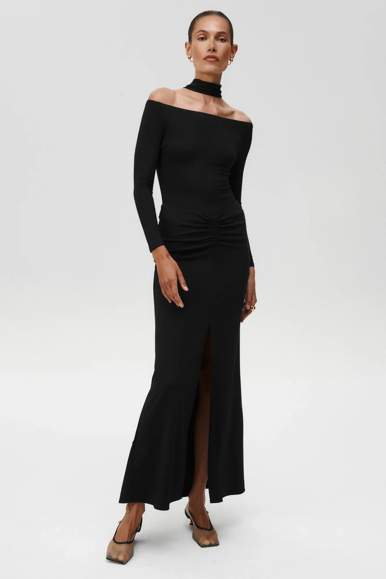 Black bodysuit made of Lyocell. Long sleeves. Elastic, close-fitting fabric. Half-neckline and a slightly asymmetric cut-out imitating a boat neckline. Slightly open shoulders. Snap button closure at the bottom. Available also in cream, hazel and brown. Paulina wears a size S and is 181 cm (5’11¼’’) tall. Sophie wears a size M and is 177 cm (5’9¾’’) tall. Made and designed in Poland.