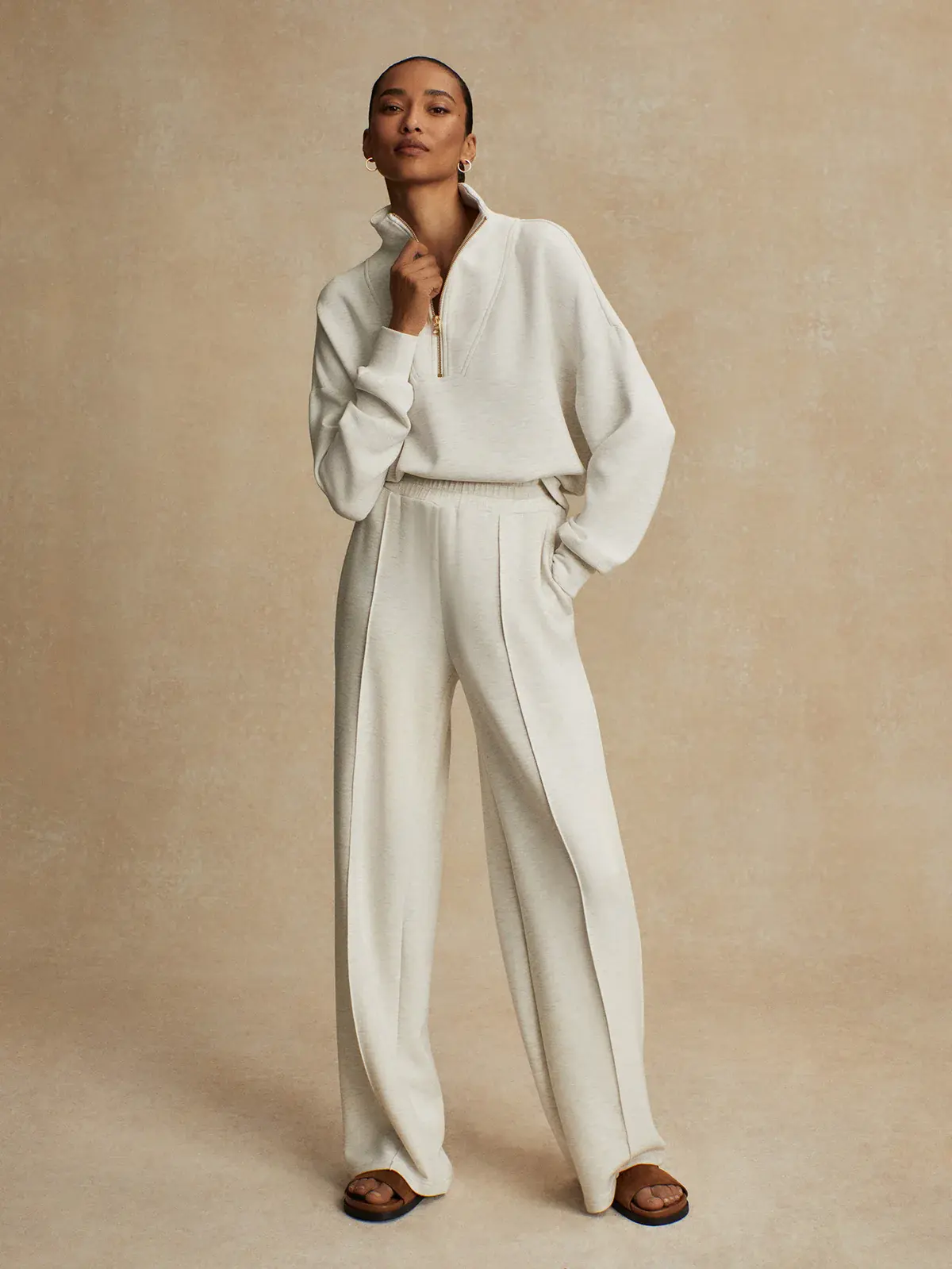 Experience unmatched comfort and style in these DoubleSoft® pants. Featuring a high-rise waist, wide-leg silhouette, elasticated waist with internal drawcord, and elegant pink tuck detailing, they're a versatile wardrobe essential.