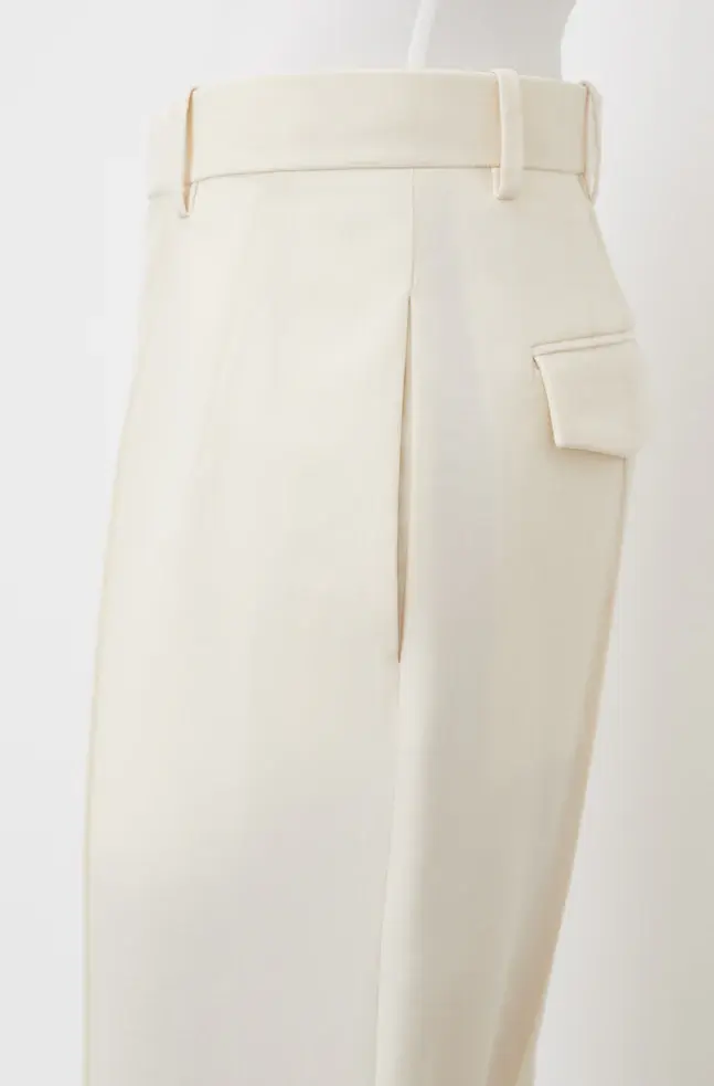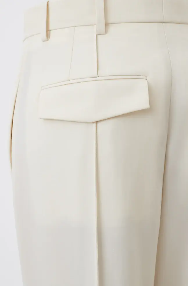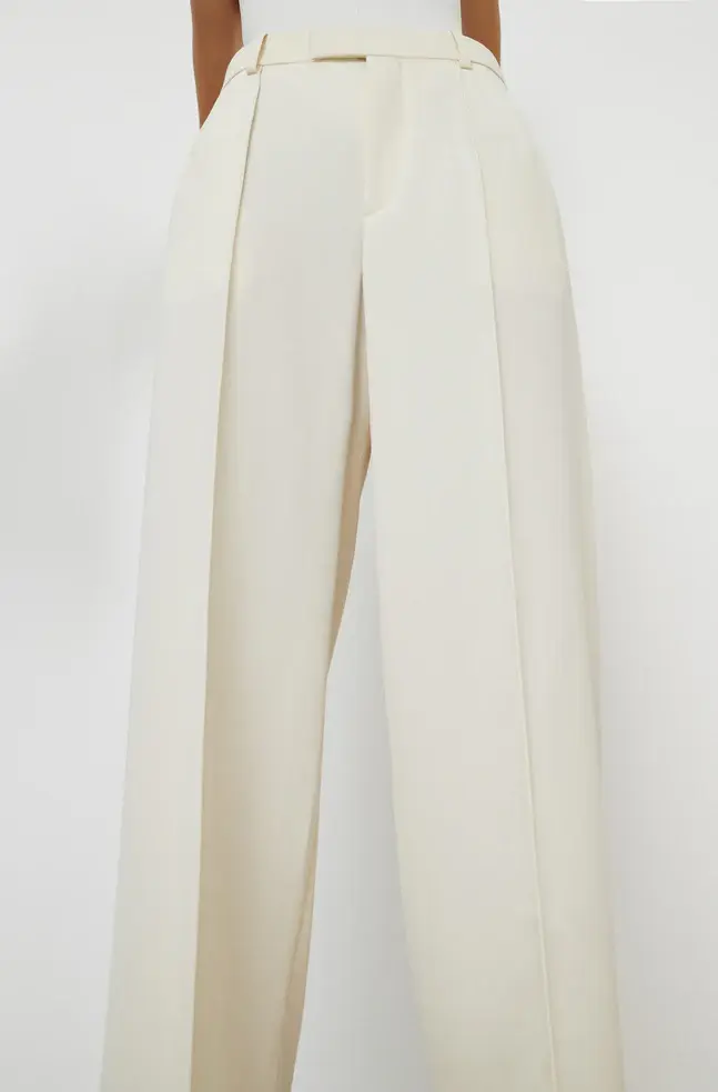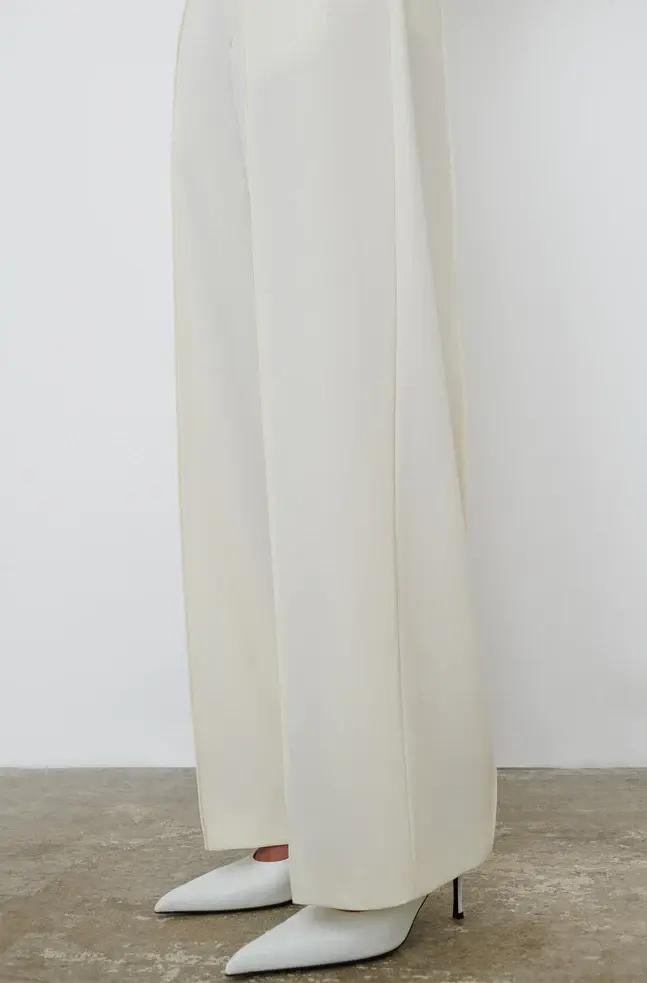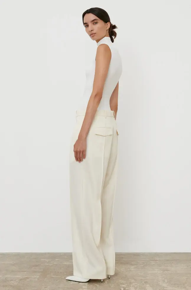 A modern tailored Trouser, as imagined by Rosie. Crafted in a fine Italian wool, the Trouser is designed to sit on the high hip, with wide legs tapered to the ankle, and elongating pintuck details at front and back. Wear as a suit with RHW Blazer Dress for evening, or more casually with RHW Long Sleeve Bodysuit, and RHW Sweater for day.