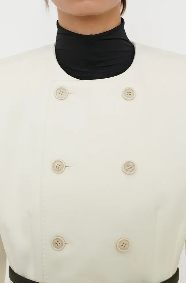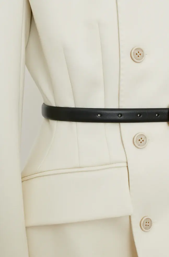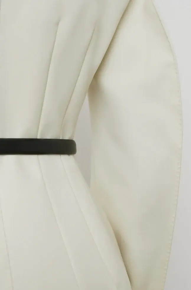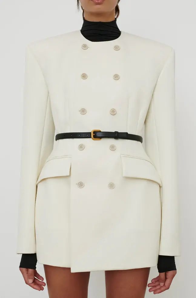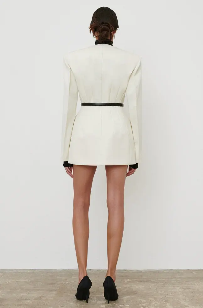 The RHW Blazer Dress is designed with a sculptural silhouette that enhances the wearer’s natural shape. Crafted in a technical Italian wool blend, the RHW Blazer elevates classic tailoring with a statement shoulder, precisely engineered darts, a collarless neckline, and double breasted closure. Style with the RHW Stretch Trouser to create a modern ensemble, or wear as a mini dress with the RHW Web Tight and Bodysuit for evening.