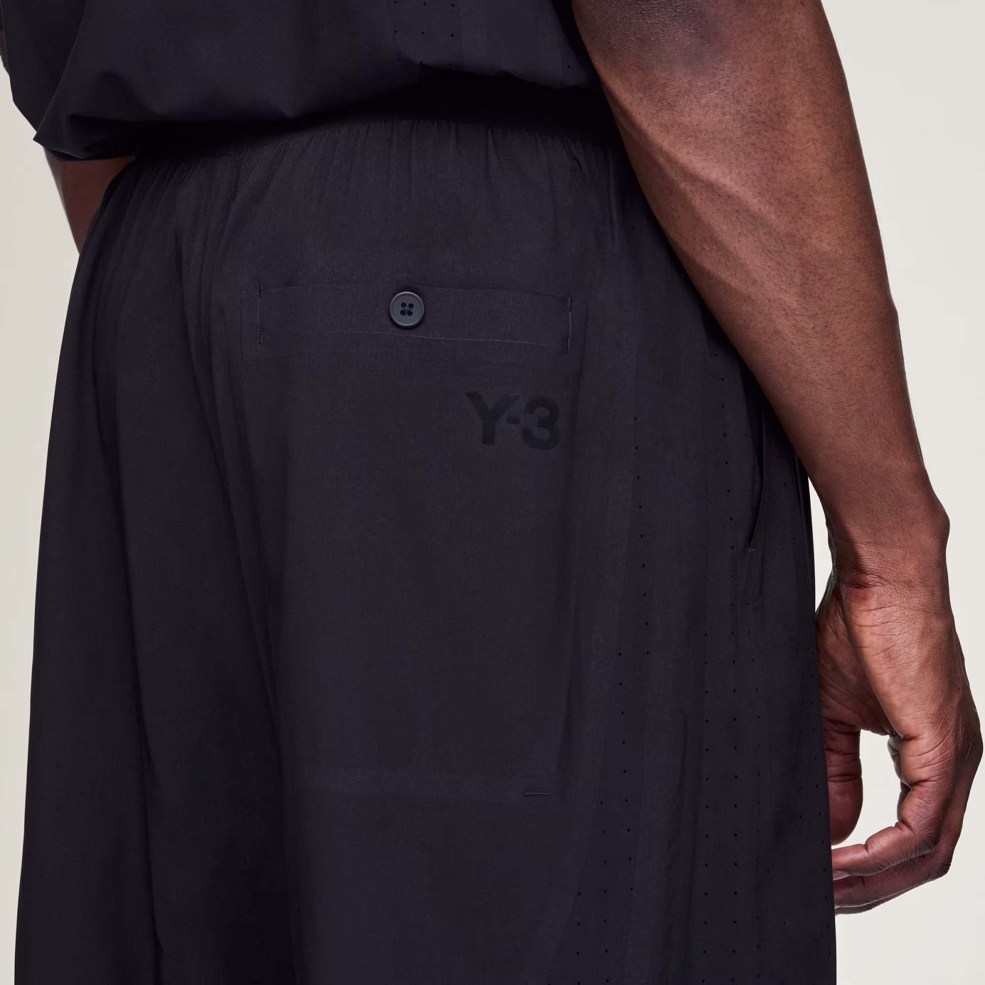 Regular fit Tie cord with elasticized waistband 86% polyester (100% recycled), 14% elastane Slip-in side pockets Bonded slits for ventilation Y-3 logo