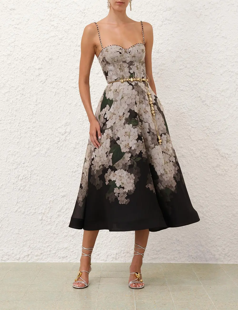 The Balance Picnic Dress in Black Hydrangea from our Spring 2025 Collection, Illumination. A silk linen midi dress featuring a fitted bustier with a bead trim, shirred back bust and adjustable shoulder straps.