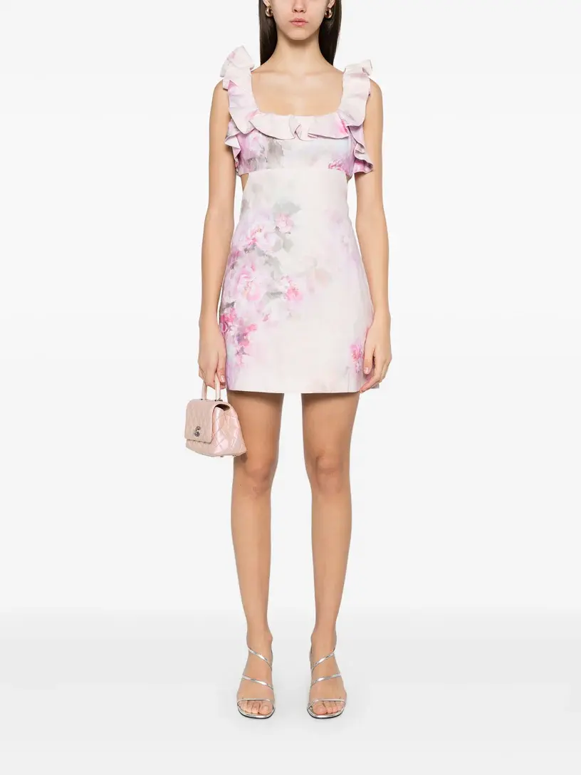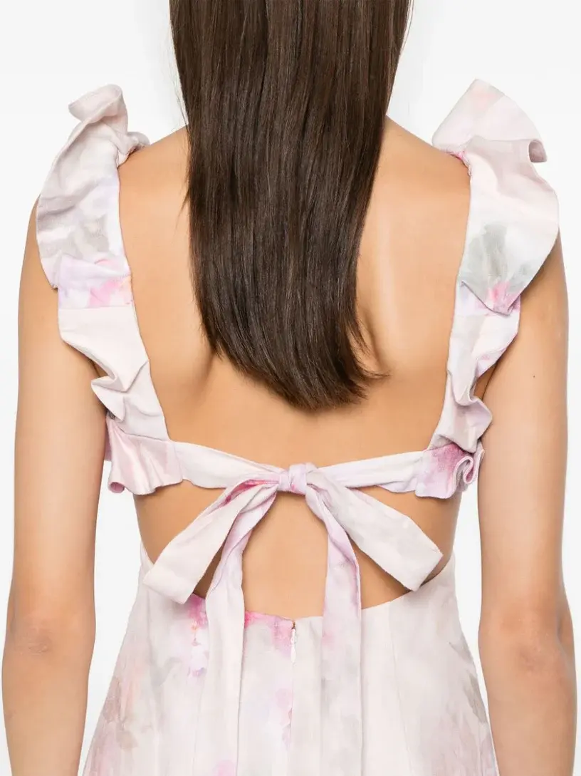 Square neckline with frill detail Cutaway back with self tie closure Invisible zip closure at centre back