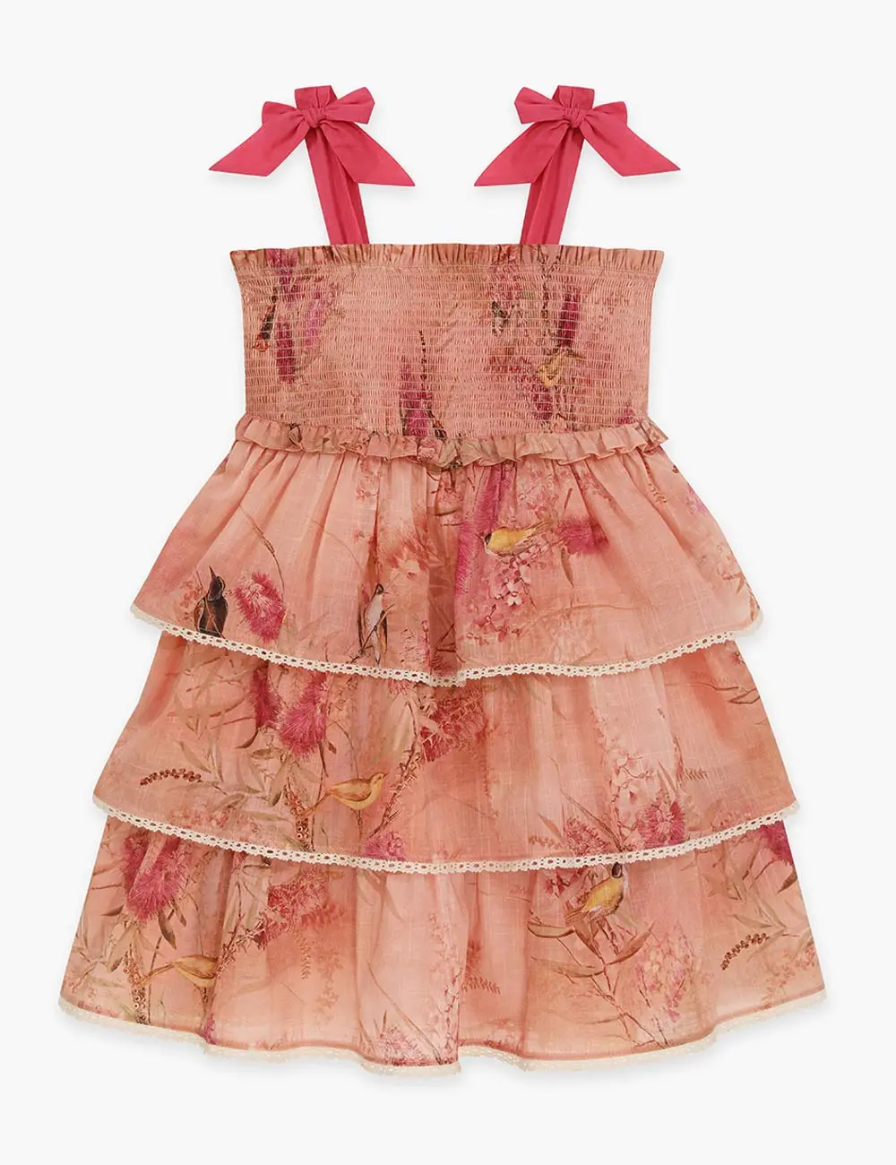 The Cascadian Kids Tiered Dress in Pink Botanical Floral from our Summer Swim 2025 Collection. A cotton dress with a shirred bodice, fixed shoulder bows and a tiered ruffle skirt. 100% cotton fabric Knee length kids cotton dress Self fixed contrasting shoulder straps Elasticated bodice with frill edges Ruffled tiered skirt with scalloped edges