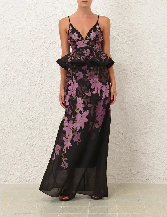 The Dawning Ruffle Slip Dress in Black Lily from our Spring 2025 Collection, Illumination. A silk linen full-length dress featuring a plunging V-neckline, a fixed waistband with a peplum-style frill, finished with an elastic strap at the centre back with a clasp.