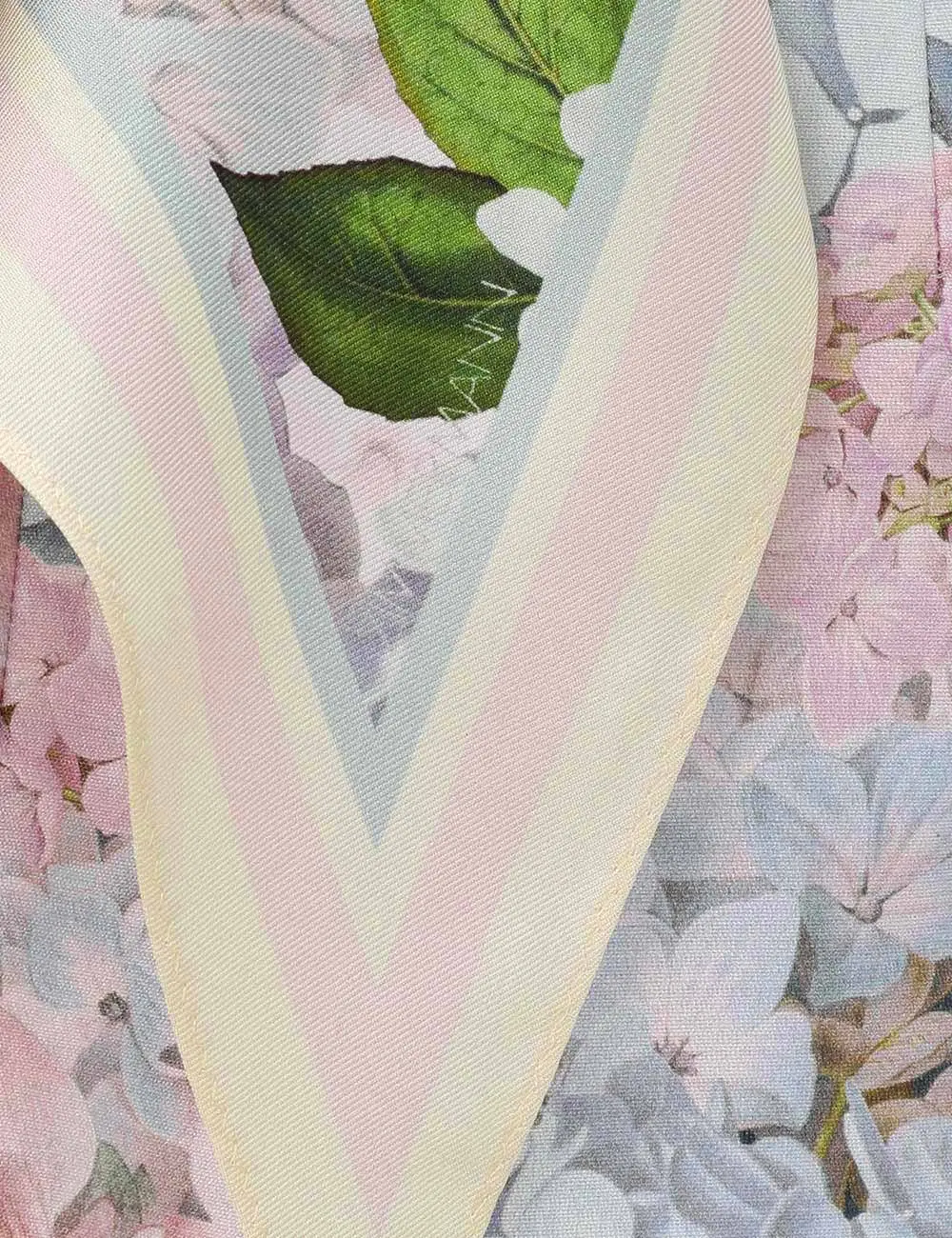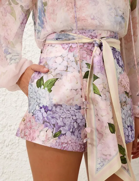 The Dawning Flat Front Short in Multi Hydrangea from our Spring 2025 Collection, Illumination. A high waisted silk short featuring side seam pockets and a removable scarf belt, finished with a centre back zip.