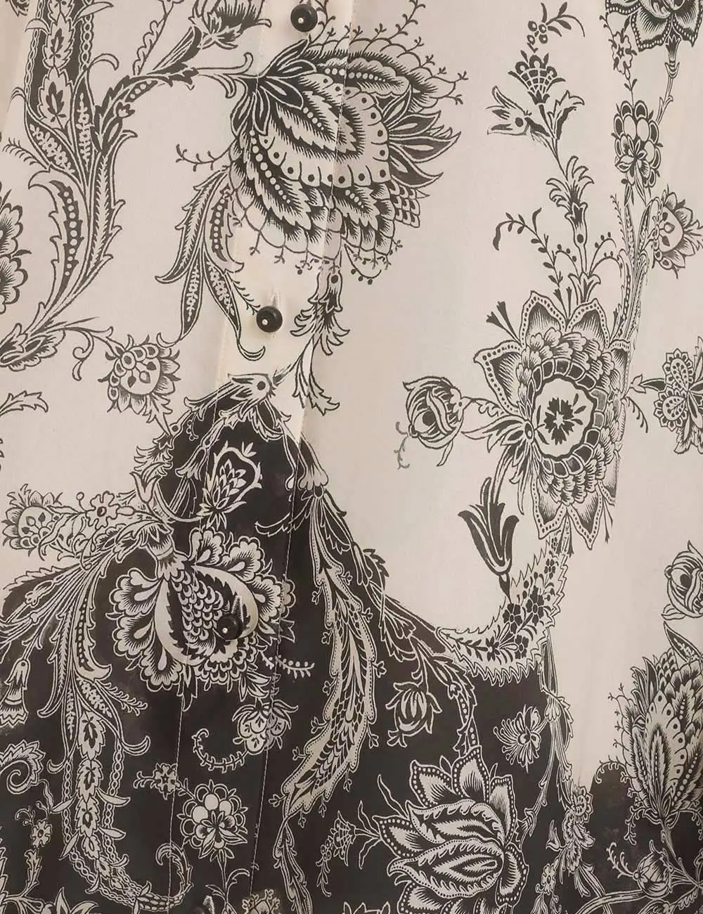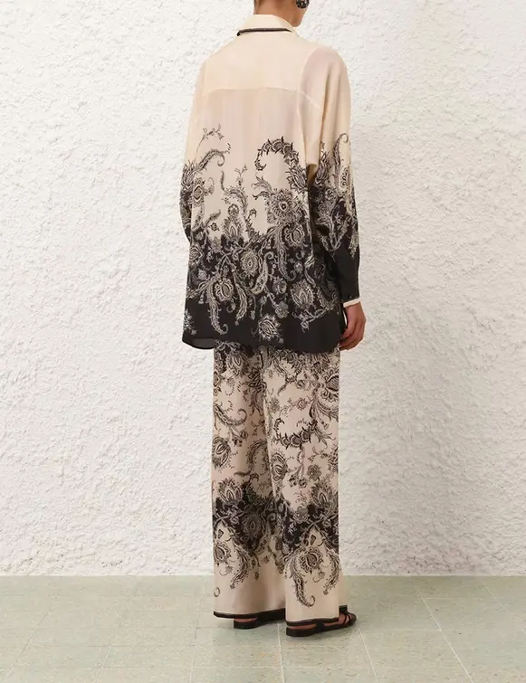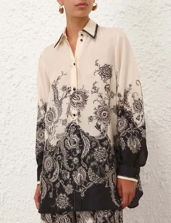 The Rhiannon Relaxed Shirt in Cream/Black Floral from our Summer Swim 2025 Collection. A silk habutae shirt featuring a bold placement print, classic collar with contrasting trim detailing, black stone buttons down the centre front, finished with side splits below the waist. 100% silk fabric Long sleeves Buttoned cuffs with contrasting hem Loose fit Splits on both sides of the shirt