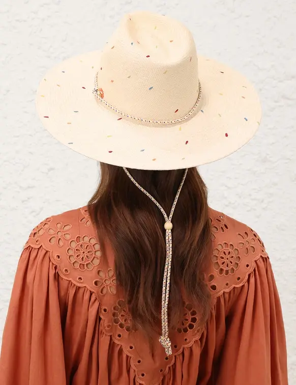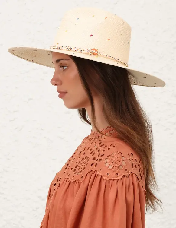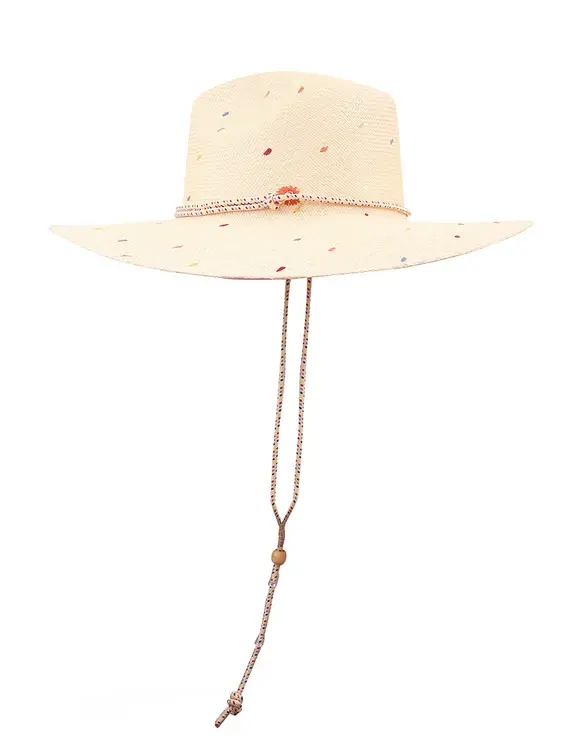 The Embroidered Panama in Natural/Multi from our Resort Swim 2026 Collection. A straw sunhat featuring a long brim and removable rope tie. 100% straw Long brim Embroidery detailing Rope fastening for adjustable fit