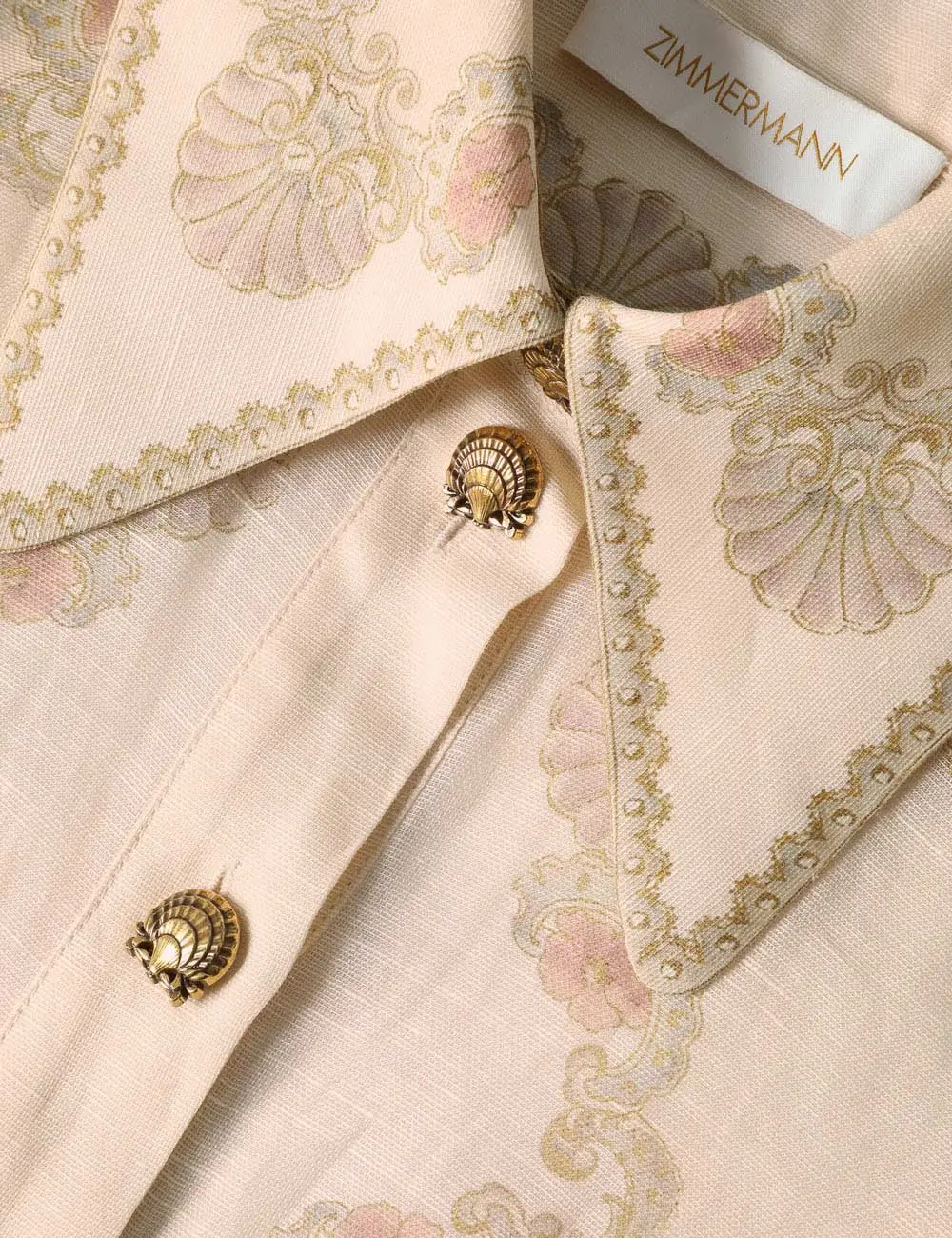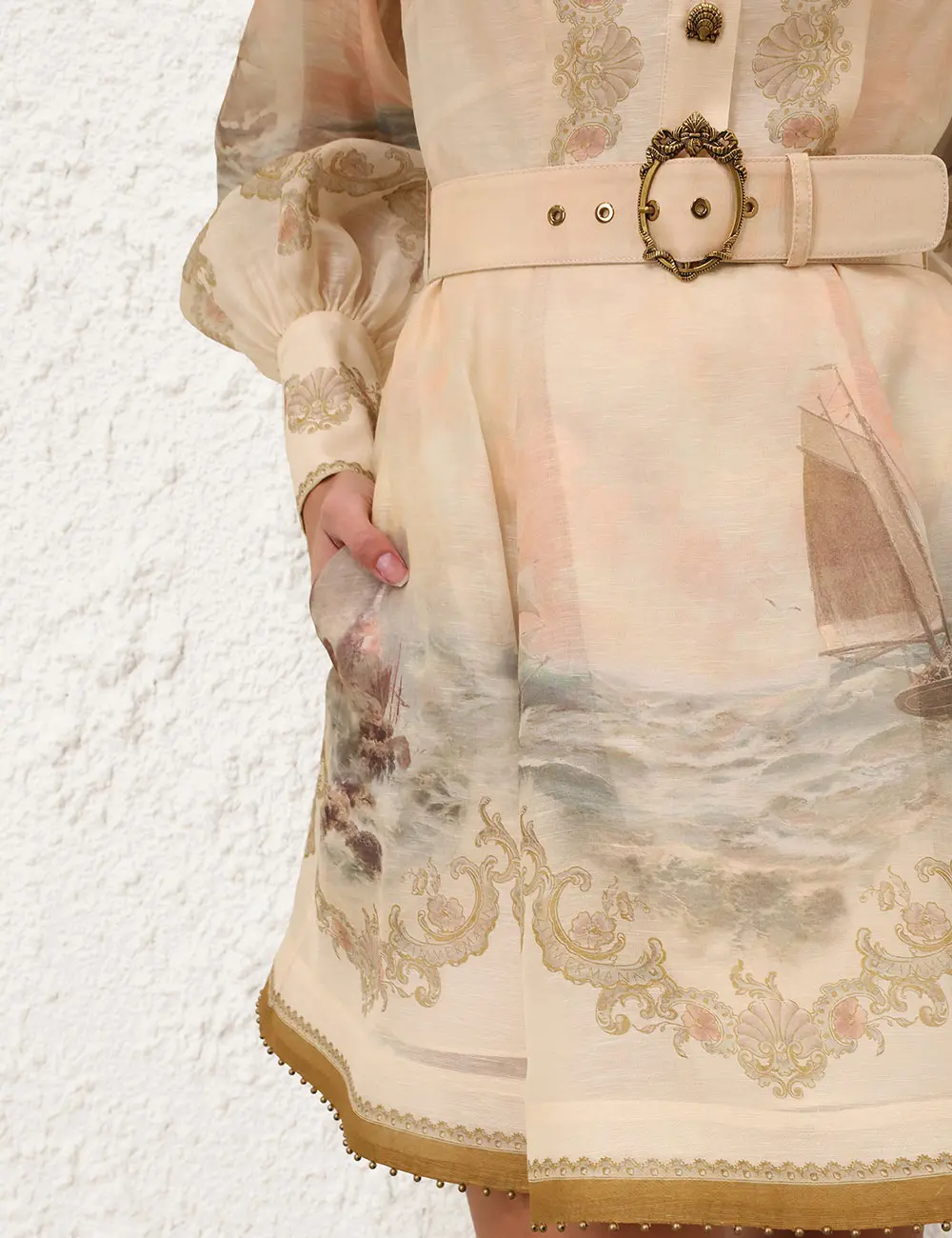The Rebellion Marine Mini Dress in Sunset from our Cruise 2026 Collection, Twisted Romance. A silk-linen mini dress featuring a classic collar, functional buttons down the centre front, a removable waist tie belt, finished with a fully flared skirt.