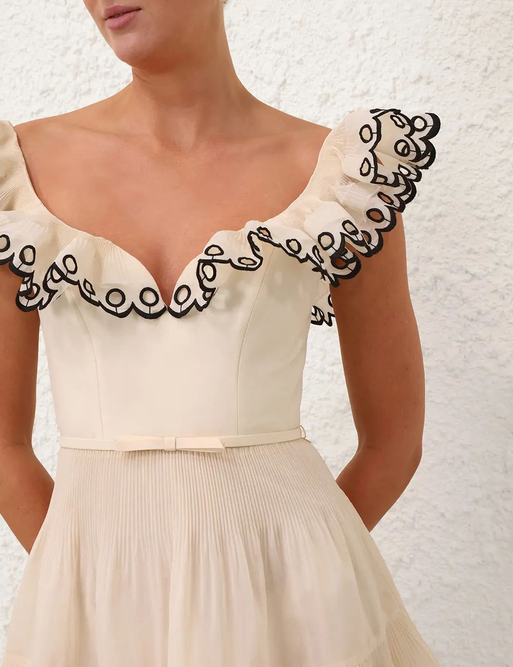 The Embroidered Frilled Mini Dress in Cream from our Cruise 2026 Collection, Twisted Romance. A mini-length dress featuring a sweetheart V-neckline, frill detailing, a removable waist belt, and a tiered pleated skirt.