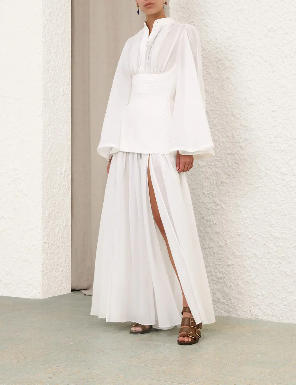 The Rebellion Corded Gown in Ivory from our Cruise 2026 Collection, Twisted Romance. A ramie gown featuring a stand collar, long angel sleeves, fitted corset bodice, finished with an invisible zip closure, and gathering throughout.