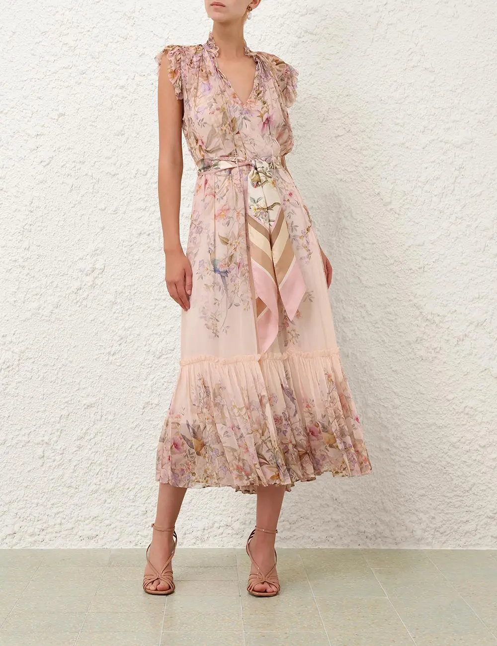 The Rebellion Flutter Dress in Cream Aviary from our Cruise 2026 Collection, Twisted Romance. A midi dress featuring a gathered, self-tie neckline with flower trims and a removable scarf belt, finished with frill detailing throughout.