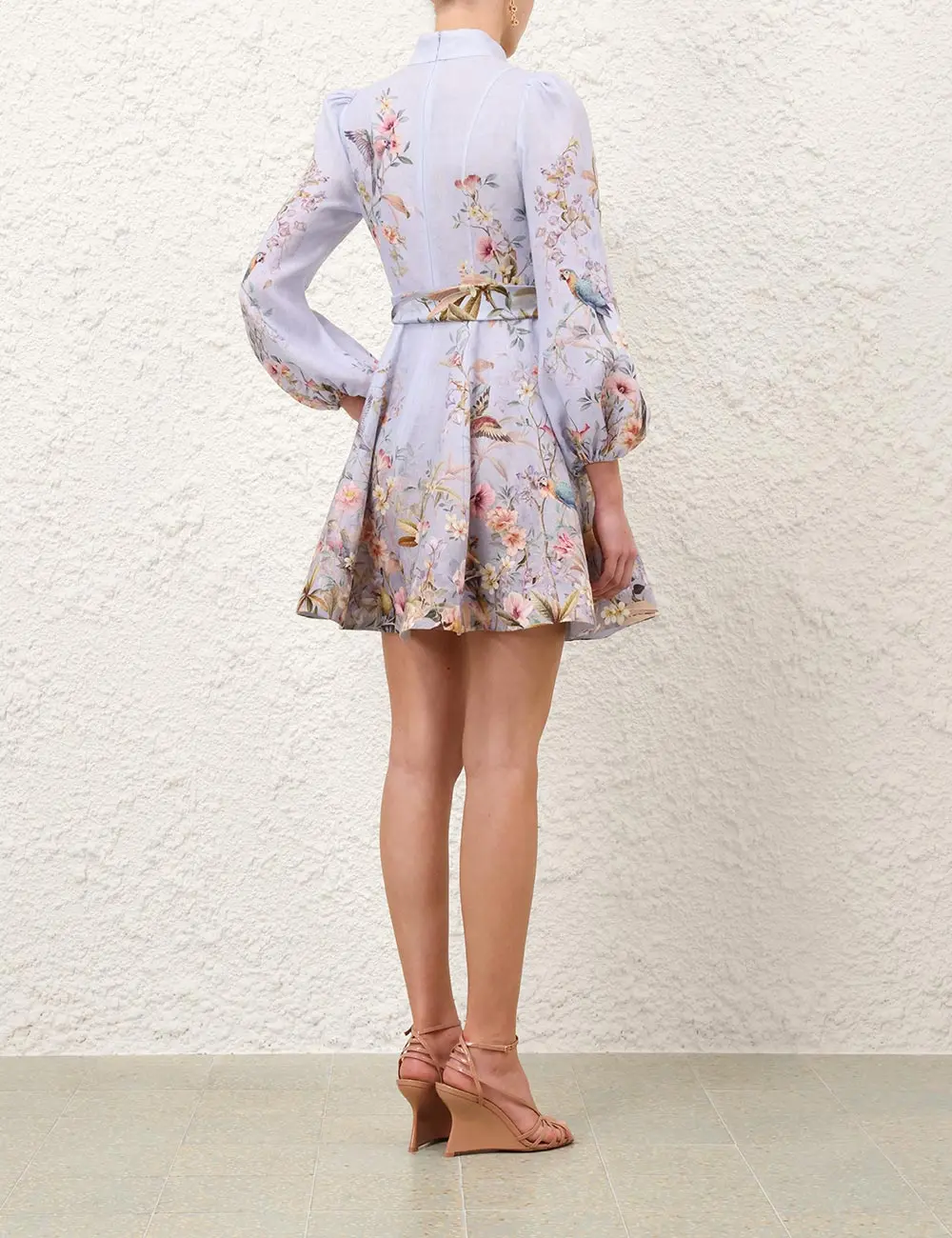The Rebellion Button Mini Dress in Blue Aviary from our Cruise 2026 Collection, Twisted Romance. A linen mini dress featuring long blouson sleeves with elasticated cuffs, functional front buttons, finished with a removable scarf belt.