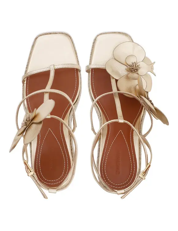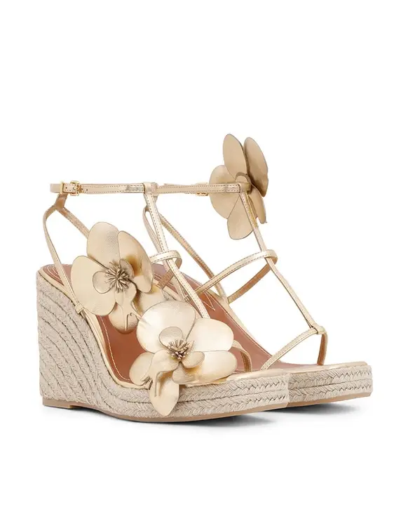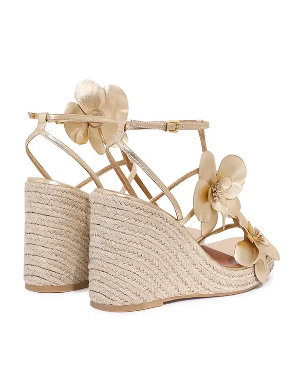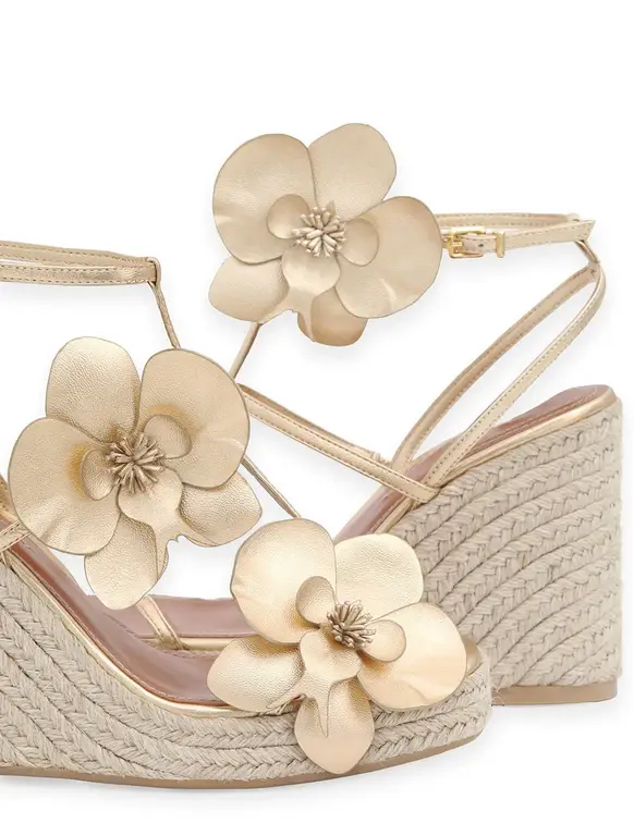 The Orchid Wedge 110 in Gold from our Summer Swim 2025 Collection. A wedge heel featuring a statement orchid flower design and a buckle ankle fastening.