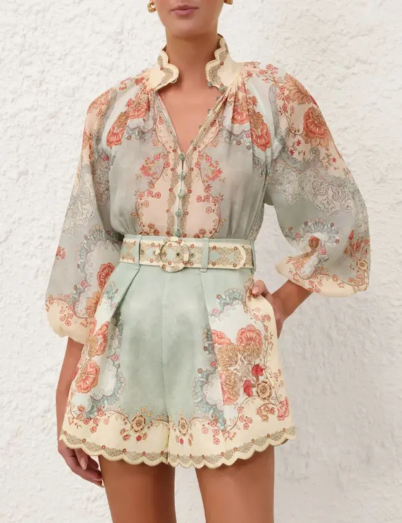 The Daylight Blouse in Wallpaper Floral Mint from our Resort Swim 2026 Collection. A ramie blouse featuring a stand collar with scalloped trim, rouleau buttons down the centre front and long sleeves with elasticated cuffs.