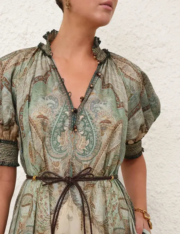 The Wanderlust Billow Dress in Tapestry Teal Multi from our Resort Swim 2026 Collection. A silk maxi dress featuring a shirred stand collar, short billowed sleeves, finished with functional side pockets and frill trim.