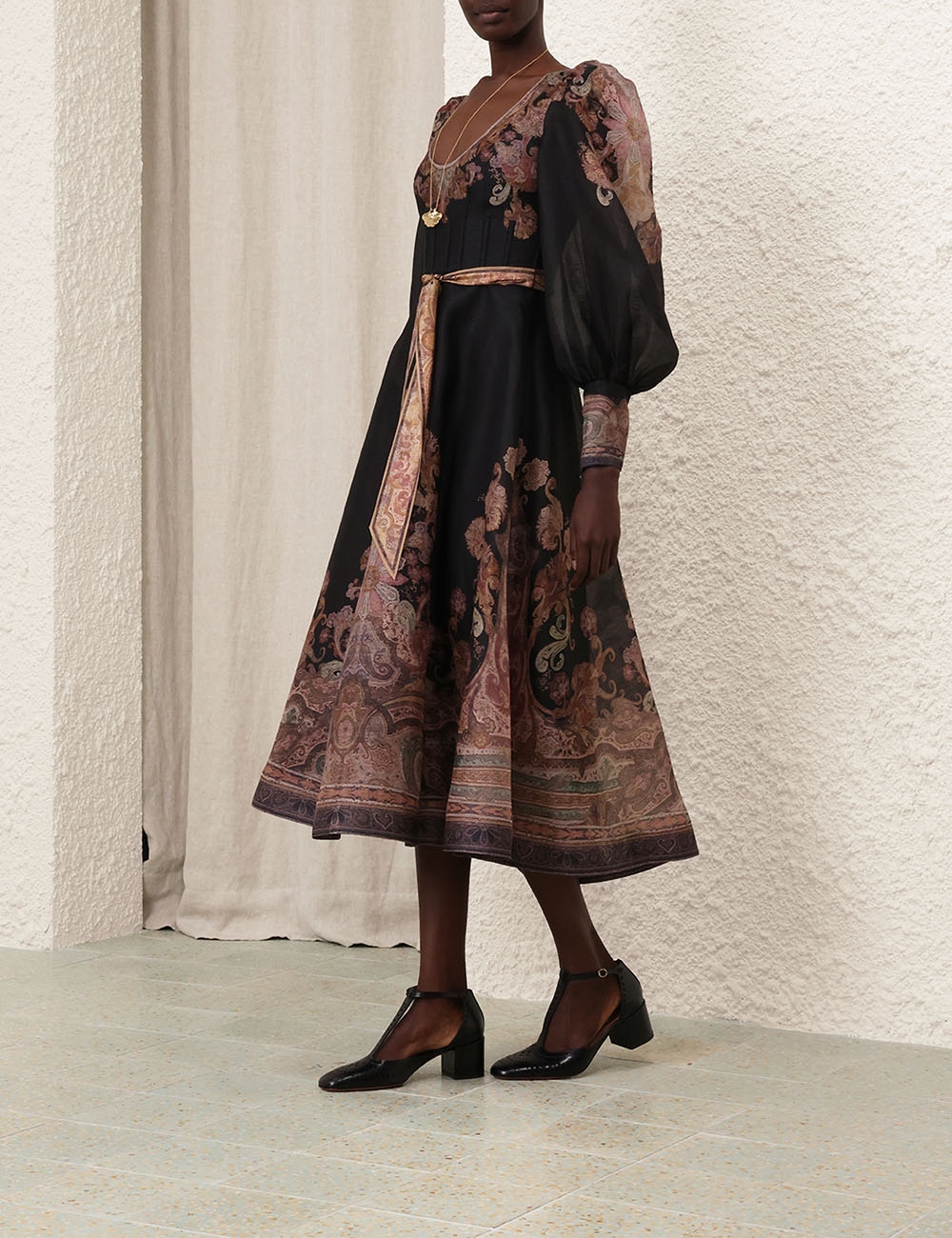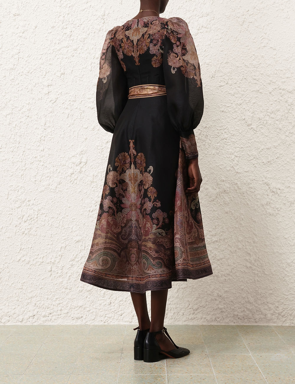 The Illustration Structured Dress in Black Paisley from our Fall 2024 Collection, In Illustration. A silk linen organza midi dress featuring a scoop neckline, long blouson sleeves with elongated cuffs with zips and a removable silk waist tie.