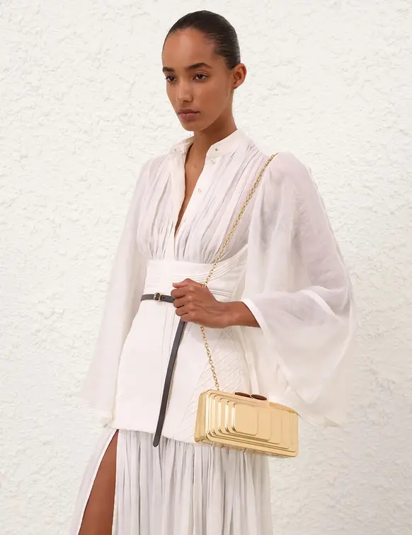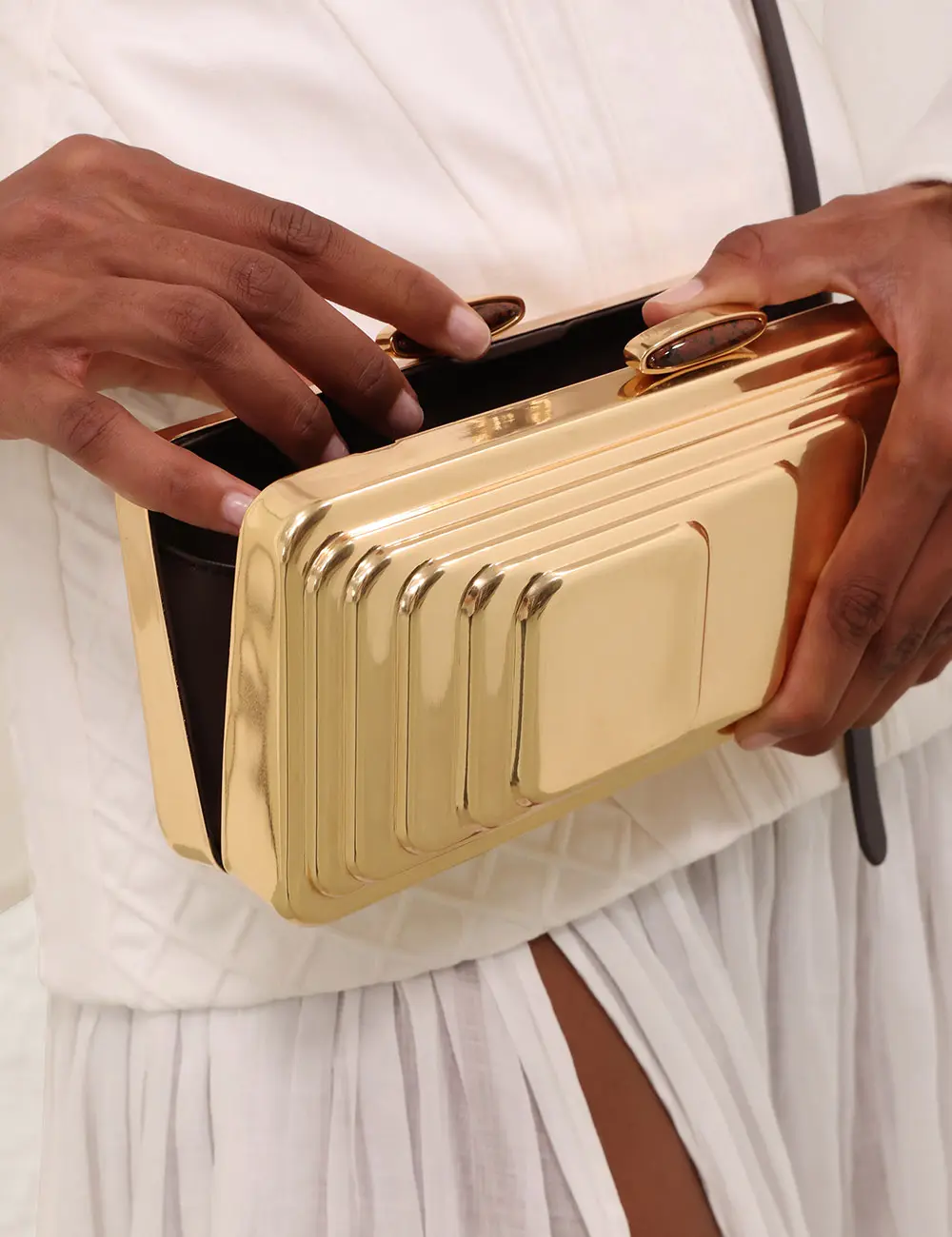 The Alight Clutch features a bespoke metal structure and intricate gold finish, ideal to carry any party essentials. Bespoke metal structure Textured design Nappa leather lining Hand-carry and crossbody Thin fixed metal chain can be concealed inside Surfboard acetate magnetic closure