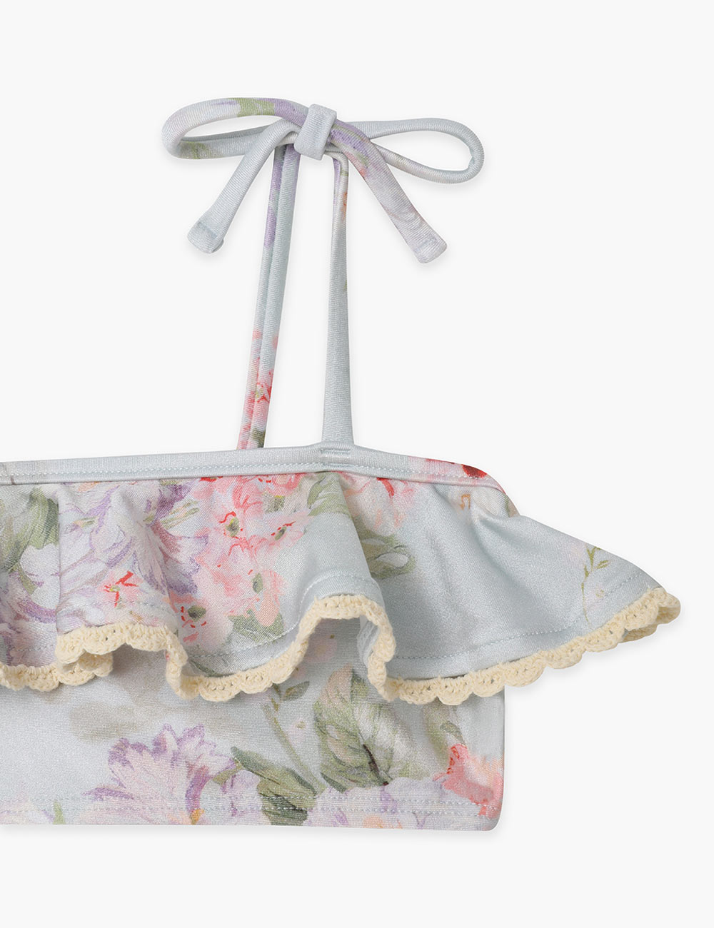A lycra frill trim bikini featuring fixed shoulder ties with bows and a frill pant.