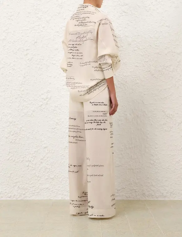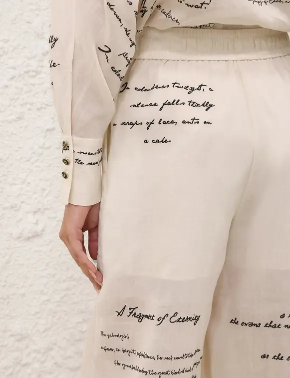 The Dream Embroidered Pant in Cream Poem from our Fall 2025 Collection, Hypnotic. A ramie mid-rise pant featuring an elasticated waistband with drawstring waist and side pockets. 100% ramie fabric Relaxed fit pant Elasticated waistband with drawstring tie Functional side seam pockets Placement embroidery throughout