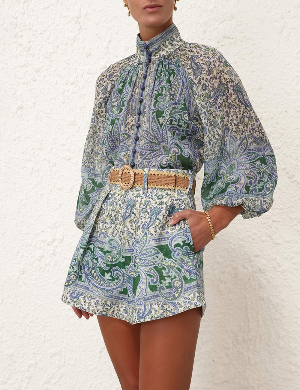 The Ottie Tuck Short in Green Paisley from ZIMMERMANN Summer Swim 2024 Collection. A high waisted linen short featuring side seam pockets and a raffia trim belt.