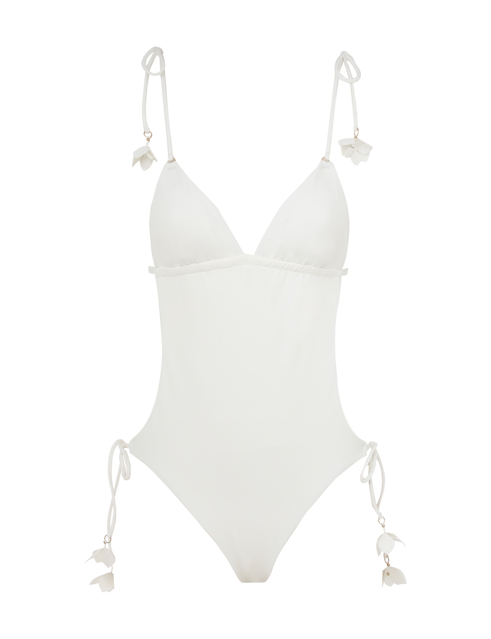 The Pop Flower Trim 1PC in Ivory from ZIMMERMANN Summer Swim 2024 Collection. An Italian lycra plunging V-neck one piece featuring self tie straps with flower trims.